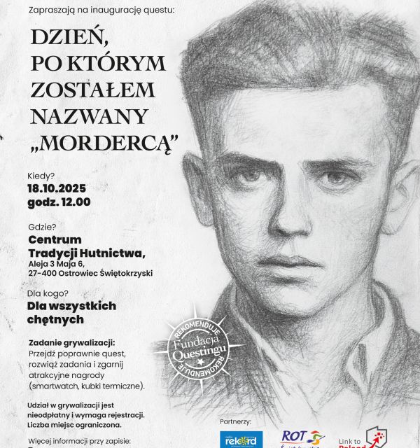 Już 18 października o godz. 12:00 w Centrum Tradycji Hutnictwa w Ostrowcu Świętokrzyskim rusza wyjątkowa gra terenowa „Dzień, po którym zostałem nazwany mordercą”. To premierowy quest przygotowany przez Fundację Questingu w ramach projektu „Ojczyzna piórem wyśniona”