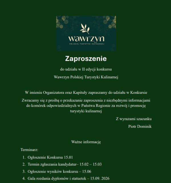 Zobacz więcejII edycja konkursu „Wawrzyn Polskiej Turystyki Kulinarnej"