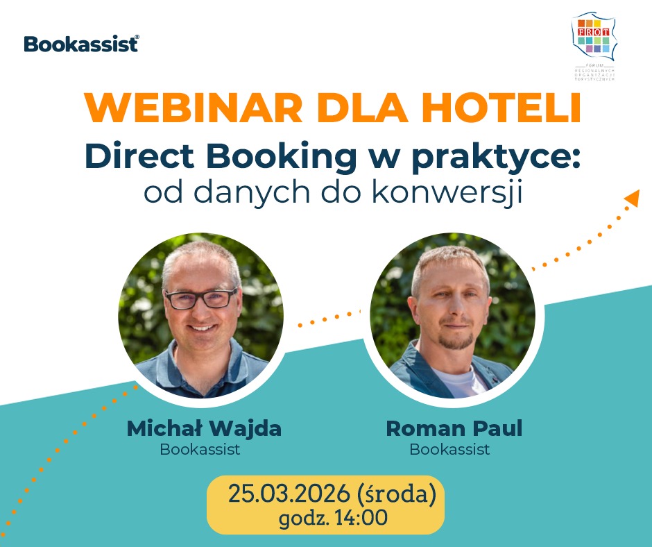 Bezpłatny webinar „Direct Booking w praktyce: od danych do konwersji” dla dyrektorów generalnych, Sales&Marketing oraz Revenue Managerów hoteli. Eksperci z Bookassist: Michał Wajda i Roman Paul pokażą na konkretnych przykładach, jak przełożyć dane, AI i dobry system rezerwacji na realną konwersję na stronie.