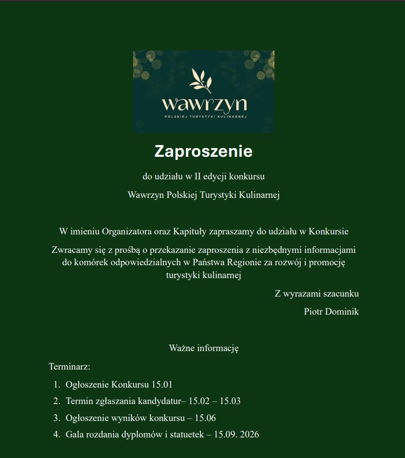 - 15.09.2026 r. - Gala Wawrzynów Polskiej Turystyki Kulinarnej
