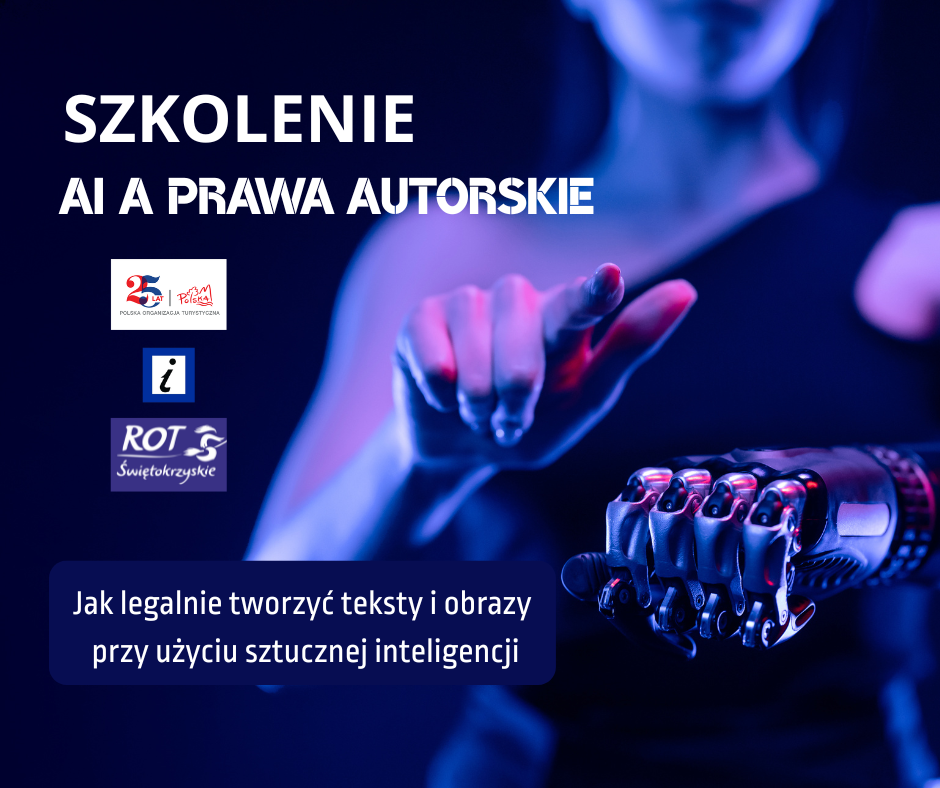 Zapraszamy informatorów turystycznych z województwa świętokrzyskiego na szkolenie AI a prawa autorskie. Szkolenie organizujemy dzięki wsparciu i dofinansowaniu Polskiej Organizacji Turystycznej w ramach rozwoju Polskiego Systemu Informacji Turystycznej.