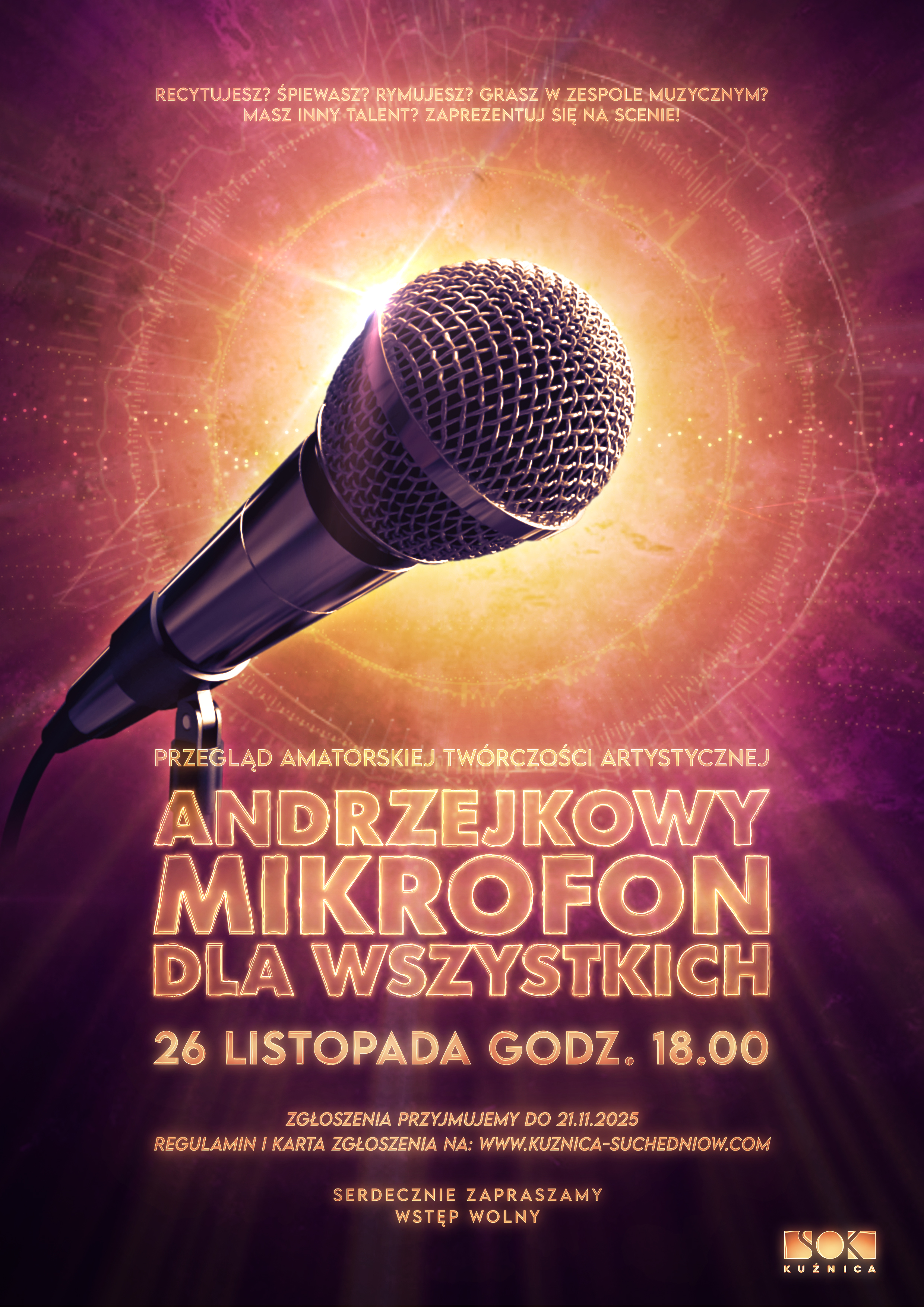 SOK "Kuźnica" zachęca do wzięcia udziału w przeglądzie amatorskiej twórczości artystycznej pn. "Andrzejkowy mikrofon dla wszystkich", który odbędzie się w dniu 26 listopada 2025 r. o godz. 18:00 w sali widowiskowej suchedniowskiej "Kuźnicy". Zgłoszenia przyjmujemy drogą mailową do dnia 21 listopada 2025 r.