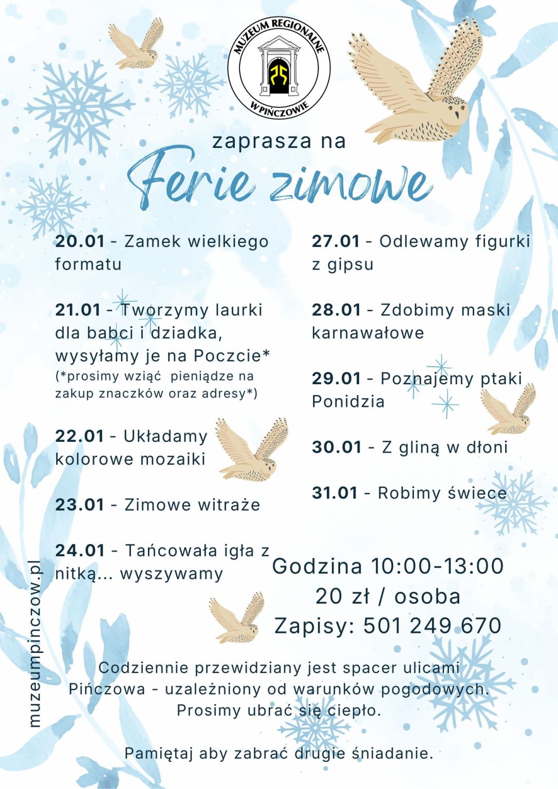 W muzealnych wnętrzach czekają zajęcia plastyczne, rękodzielnicze i tematyczne, między innymi malowanie pińczowskiego zamku, tworzenie laurek dla Babci i Dziadka, mozaik, zimowych witraży, masek karnawałowych czy świec. Nie zabraknie też lepienia z gliny, wyszywania, odlewania gipsowych figurek oraz spotkania z ponidziańską ornitologią. Każdego dnia, jeśli pozwoli pogoda, przewidziany jest również spacer ulicami Pińczowa.