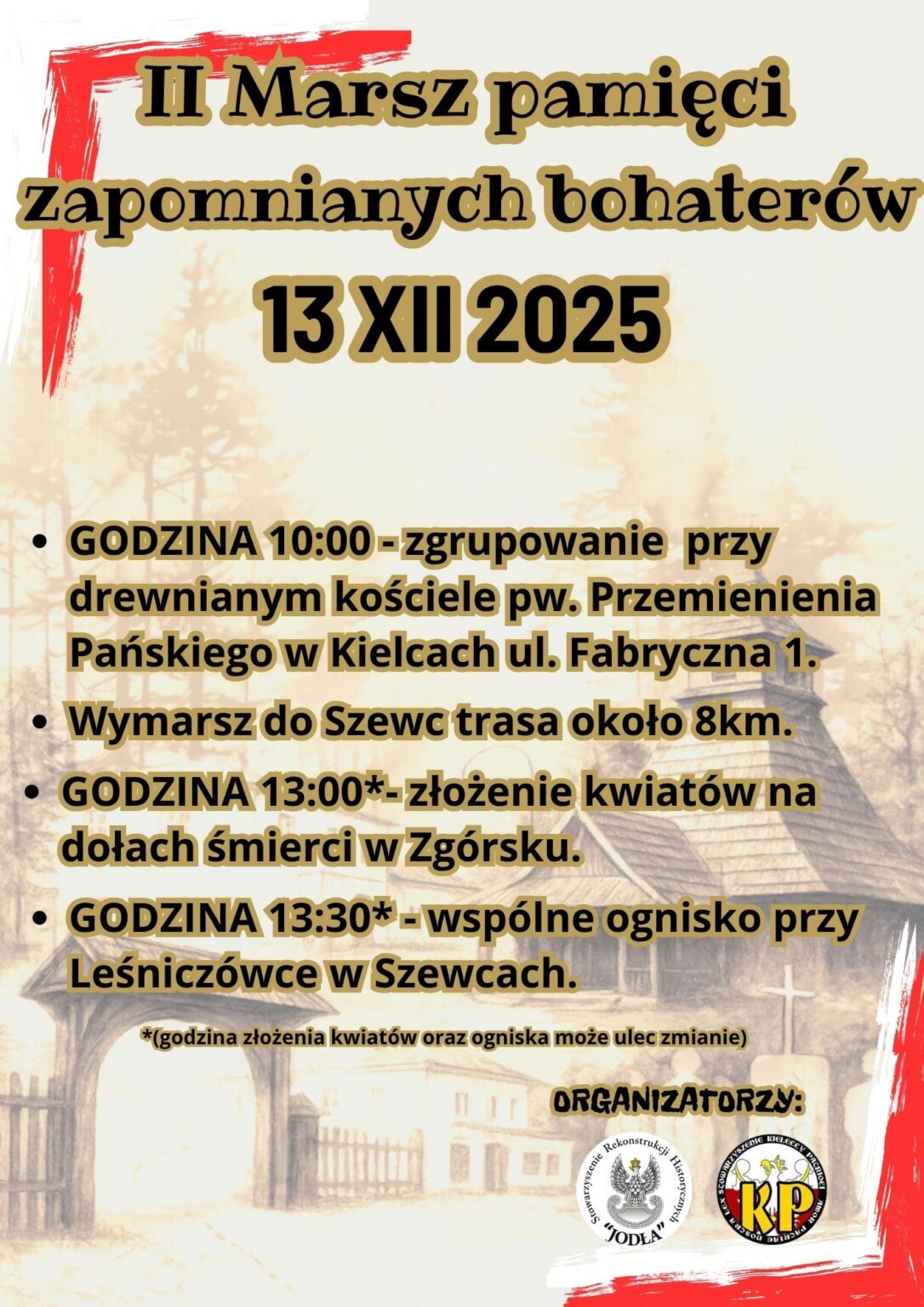 Na zakończenie marszu nastąpi uroczyste złożenie kwiatów na dołach śmierci w Zgórsku oraz wspólne ognisko i konkurs wiedzy historycznej.
