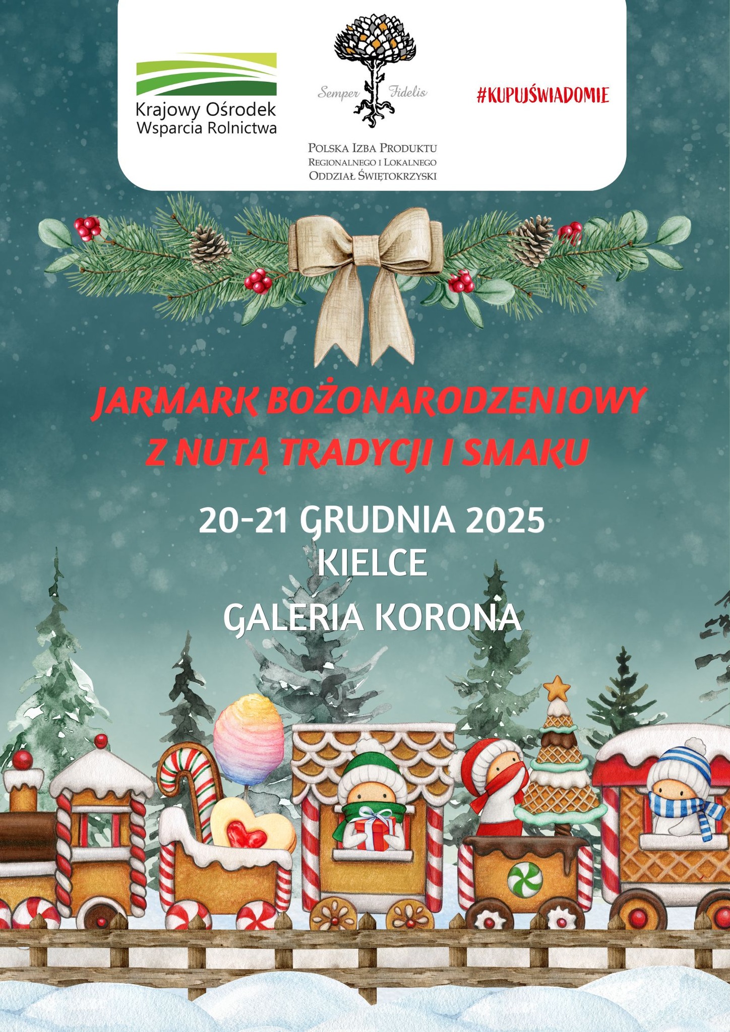 Polska Izba Produktu Regionalnego i Lokalnego Oddział Świętokrzyski oraz Krajowy Ośrodek Wsparcia Rolnictwa Oddział Terenowy w Kielcach zapraszają na Jarmark Bożonarodzeniowy, który w dniach 20–21 grudnia 2025 roku odbędzie się w Galerii Korona w Kielcach.