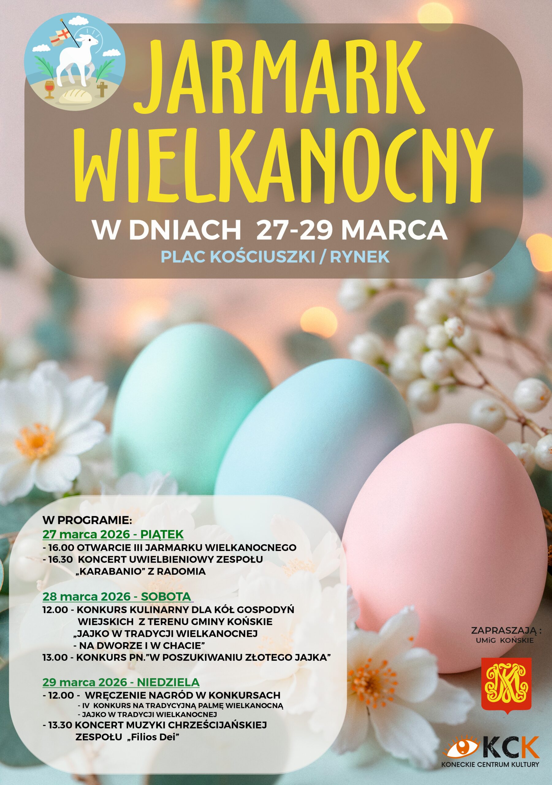 W dniach 27–29 marca 2026 roku konecki Rynek zamieni się w tętniące życiem, świąteczne miejsce spotkań mieszkańców i gości. Jarmark Wielkanocny w Końskich to trzy dni pełne tradycji, regionalnych smaków, muzyki oraz atrakcji związanych z nadchodzącymi Świętami Wielkanocnymi.