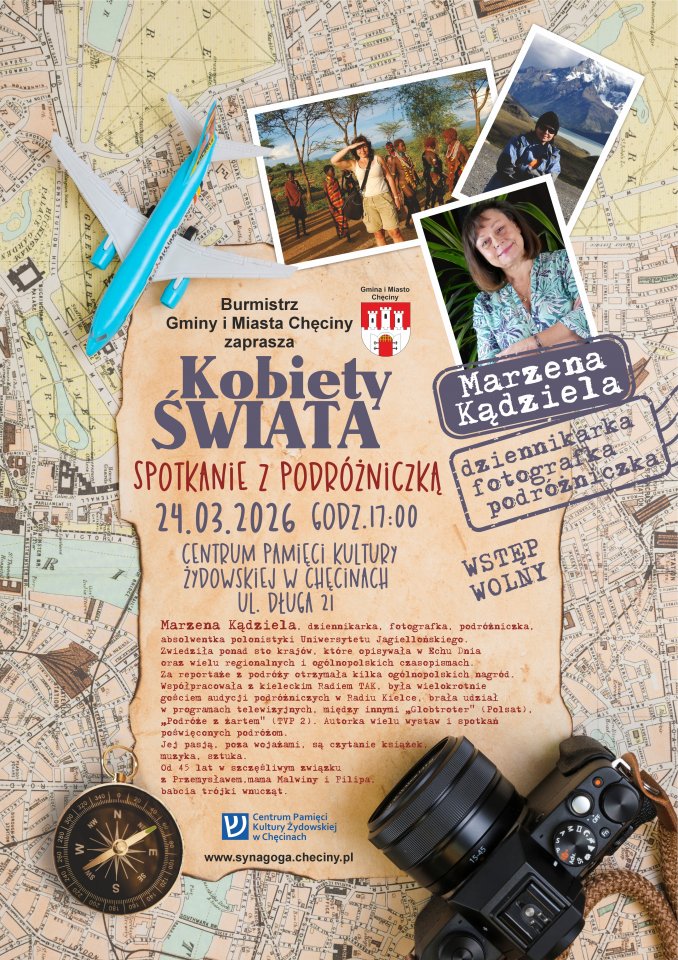 Burmistrz Gminy i Miasta Chęciny Robert Jaworski zaprasza na spotkanie z podróżniczką, dziennikarką i fotografką Marzeną Kądzielą w ramach cyklu „Kobiety Świata”. Wydarzenie odbędzie się we wtorek 24 marca 2026 roku o godzinie 17:00 w Centrum Pamięci Kultury Żydowskiej w Chęcinach.