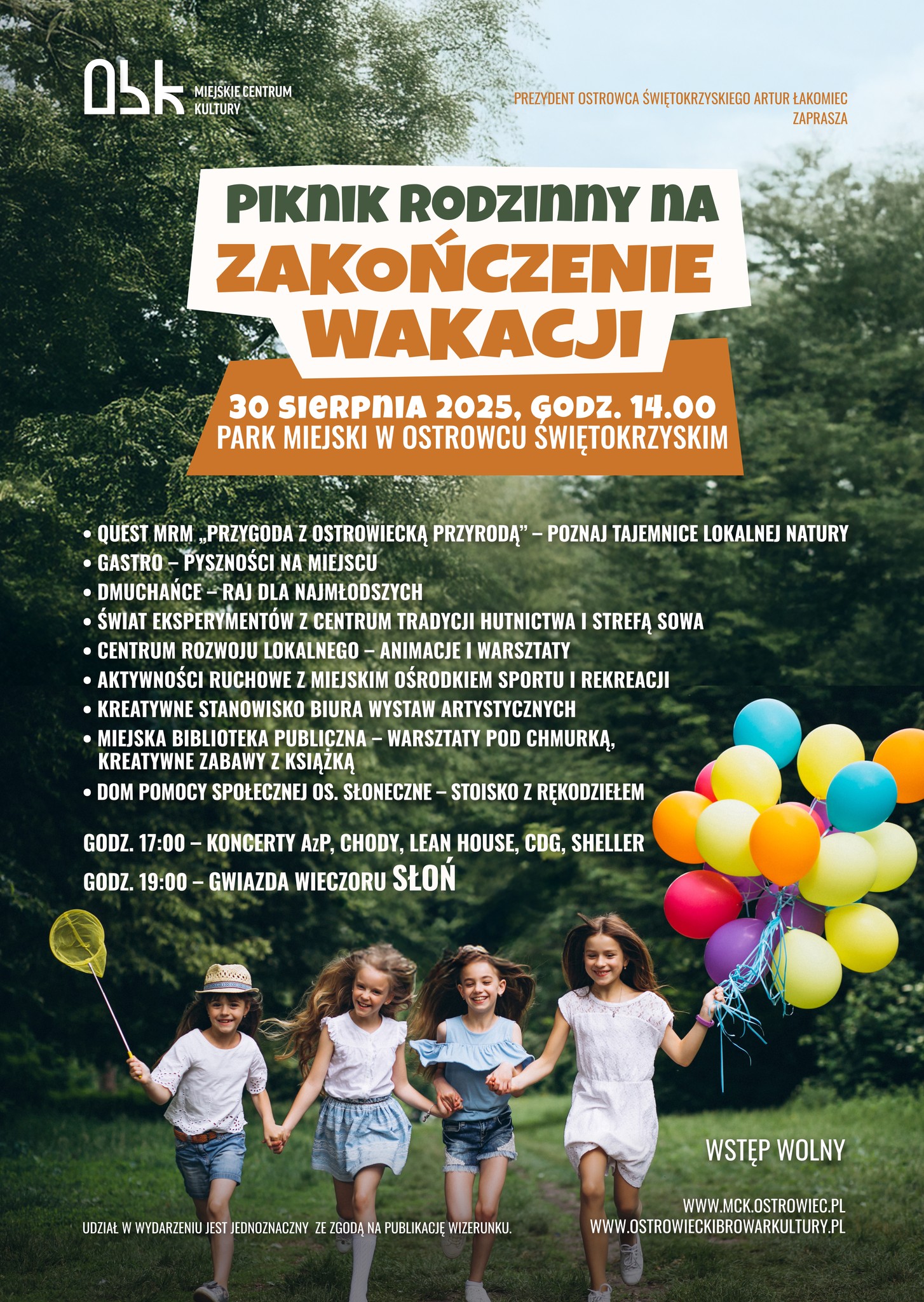 30 sierpnia 2025 roku w Parku Miejskim w Ostrowcu Świętokrzyskim odbędzie się Piknik Rodzinny na Zakończenie Wakacji, organizowany przez Miejskie Centrum Kultury wraz z partnerami. W programie znajdą się m.in. quest „Przygoda z ostrowiecką przyrodą”, strefa gastronomiczna, dmuchańce dla najmłodszych, eksperymenty przygotowane przez Centrum Tradycji Hutnictwa i strefę SOWA, animacje i warsztaty Centrum Rozwoju Lokalnego oraz aktywności ruchowe z Miejskim Ośrodkiem Sportu i Rekreacji. Swoje stanowiska zaprezentują także BWA, Miejska Biblioteka Publiczna oraz Dom Pomocy Społecznej z osiedla Słoneczne. Od godziny 17:00 na scenie wystąpią zespoły AzP, Chody, Lean House, CDG i Sheller, a gwiazdą wieczoru będzie raper Słoń.