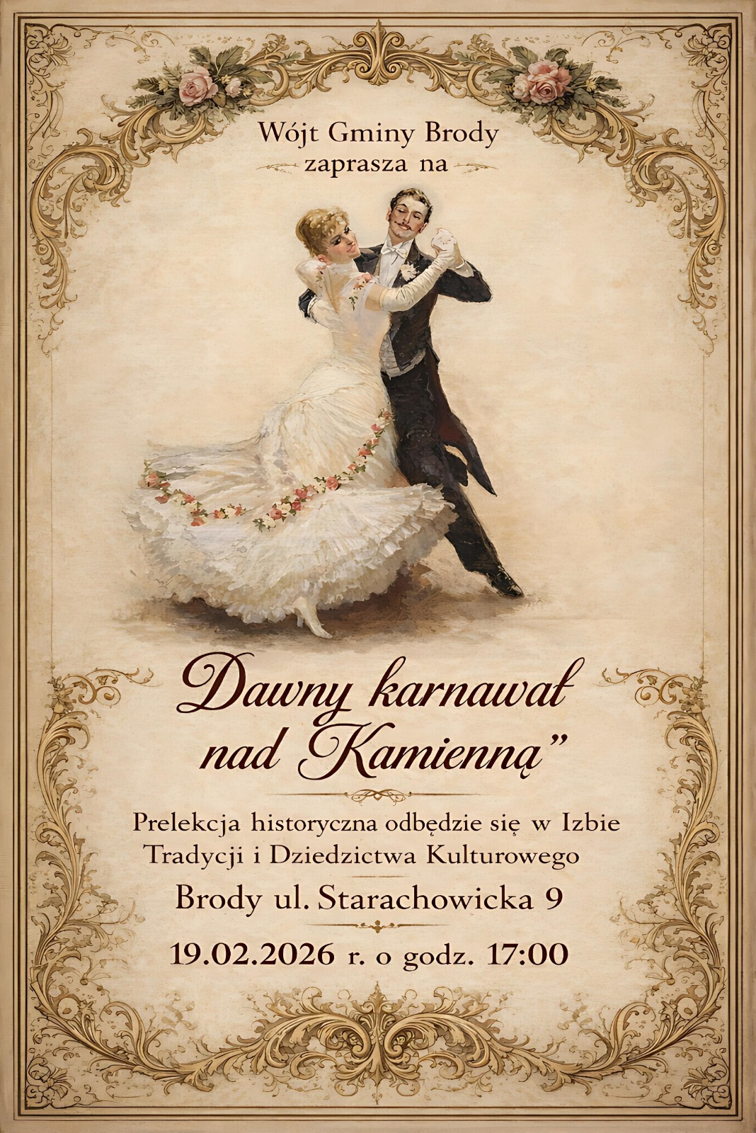 To będzie absolutny hit jeśli chodzi o zakończenie tegorocznego karnawału. Wójt Gminy Ernest Kumek, a także kustosz Izby Tradycji i Dziedzictwa Kulturowego w Brodach Grzegorz Bernaciak zapraszają na niezwykłe wydarzenie. W czwartek, 19 lutego o godz. 17.00 odbędzie się historyczna prelekcja. – Przeniesiemy się w czasie, do przełomu XIX i XX wieku, by dowiedzieć się w jaki sposób, w tamtym okresie bawiono się na balach i zapustach – zachęca kustosz Bernaciak.