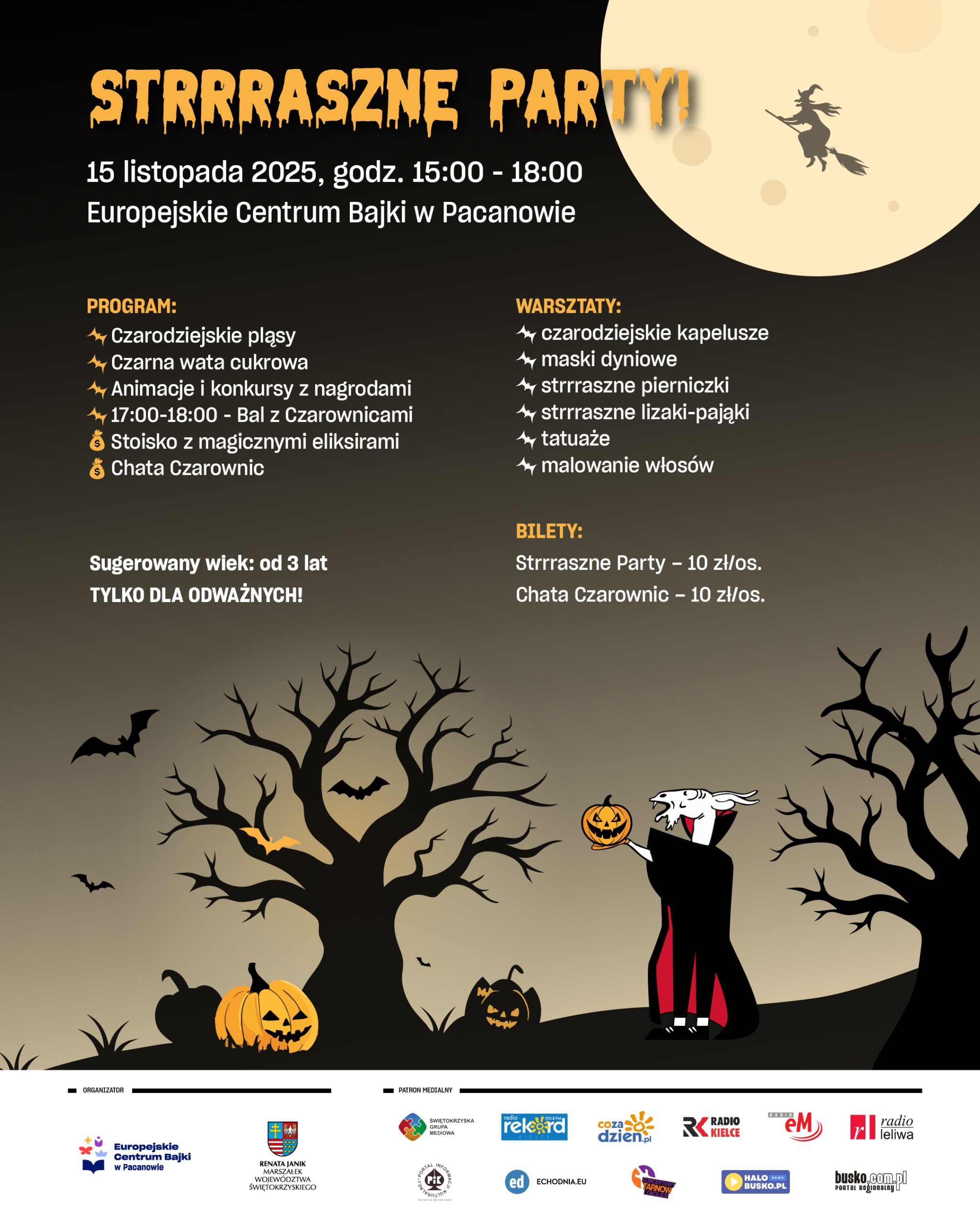 Jesienny wieczór, światło księżyca i odrobina magii. W dniu 15 listopada 2025 roku w godzinach 15:00–18:00 odbędzie się Strrraszne Party. Czarownice już szykują swoje miotły, a duchy prasują prześcieradła, bo zapowiada się naprawdę wyjątkowa impreza.