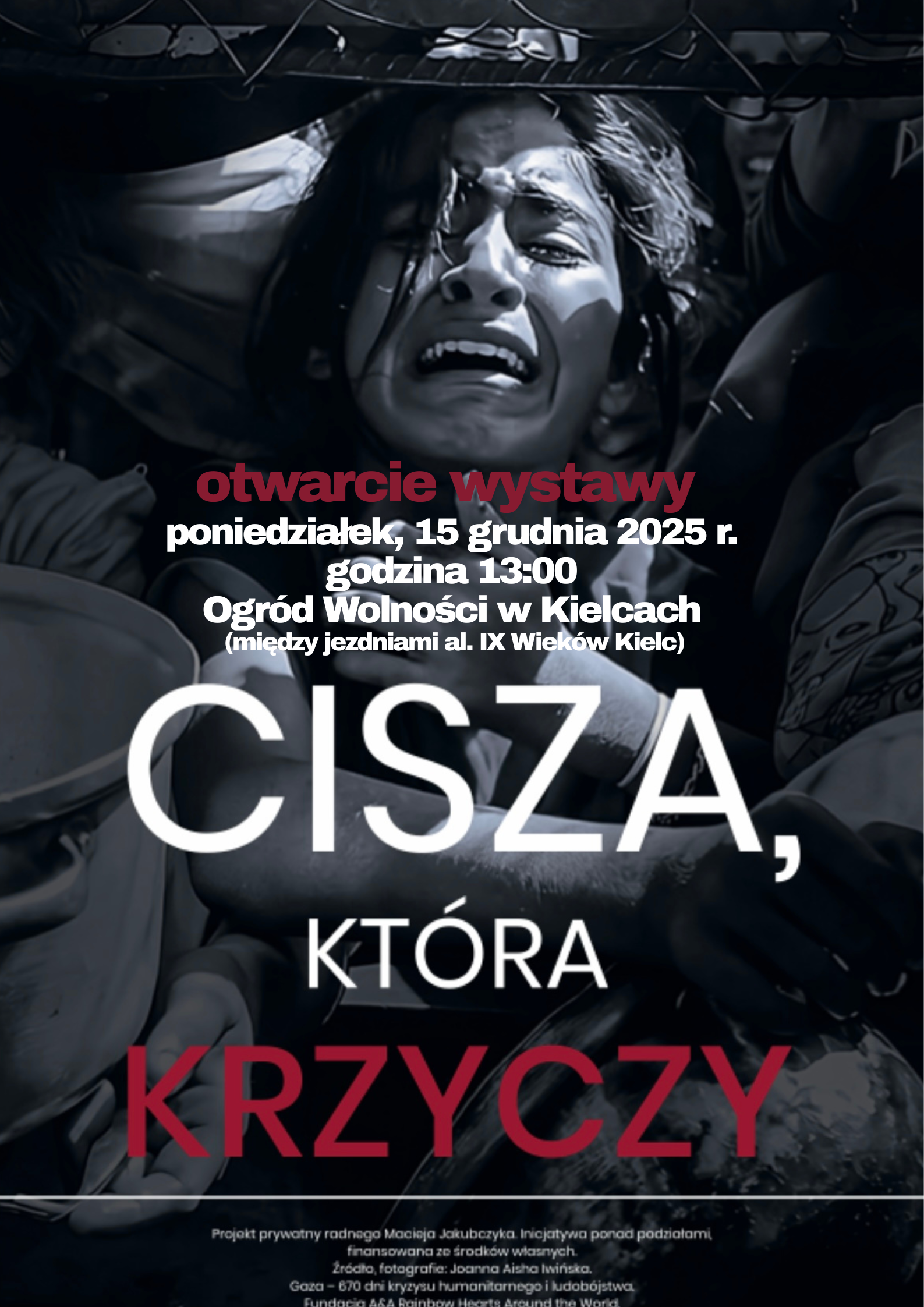 W poniedziałek, 15 grudnia 2025 r. o godz. 13:00, w Ogrodzie Wolności w Kielcach odbędzie się uroczyste otwarcie wystawy fotograficzno-informacyjnej „Cisza, która krzyczy”, poświęconej sytuacji cywilów w Strefie Gazy i konsekwencjom trwającego tam kryzysu humanitarnego.