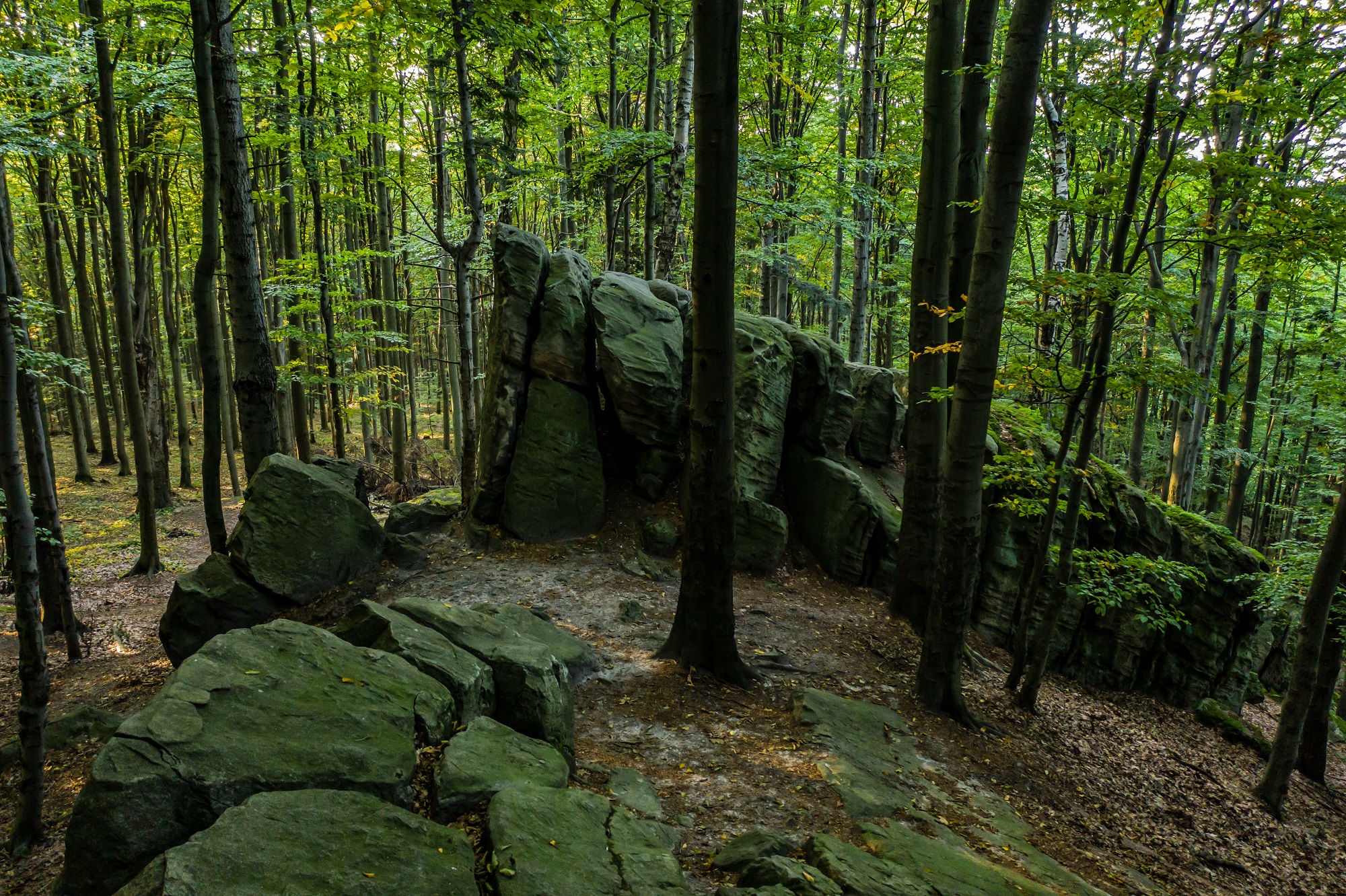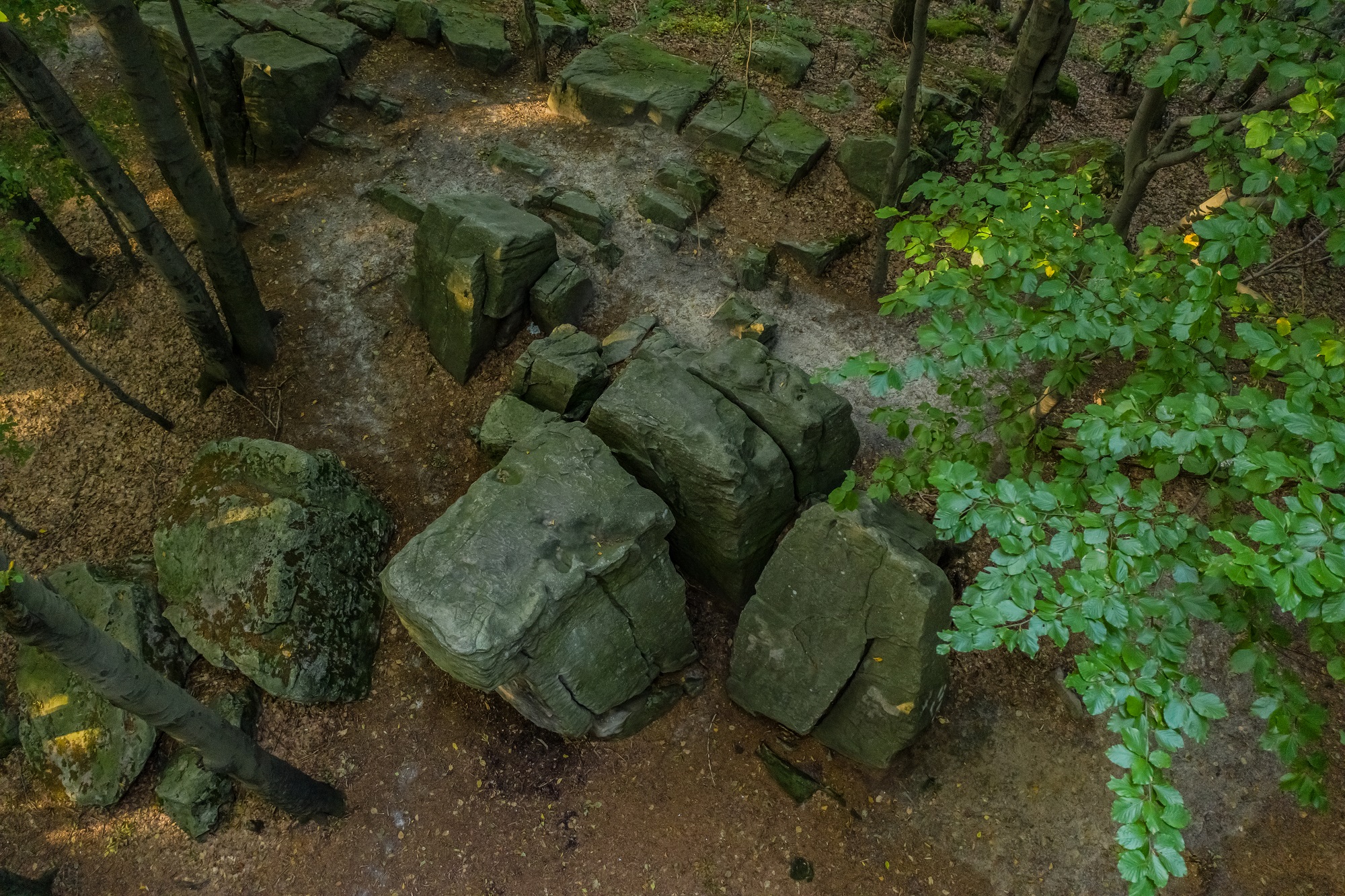 Szczególnie imponująco prezentuje się grupa bloków skalnych o kilkunastometrowej długości, z licznymi szczelinami, które wypełniają uschnięte bukowe liście. Szare porowate piaskowce, których powierzchnię wyrzeźbiła woda i wiatr, od północnej strony przybrały zielony kolor za sprawą rosnących tam glonów i porostów. W szczelinach między skałami zakorzenił się bluszcz pospolity.