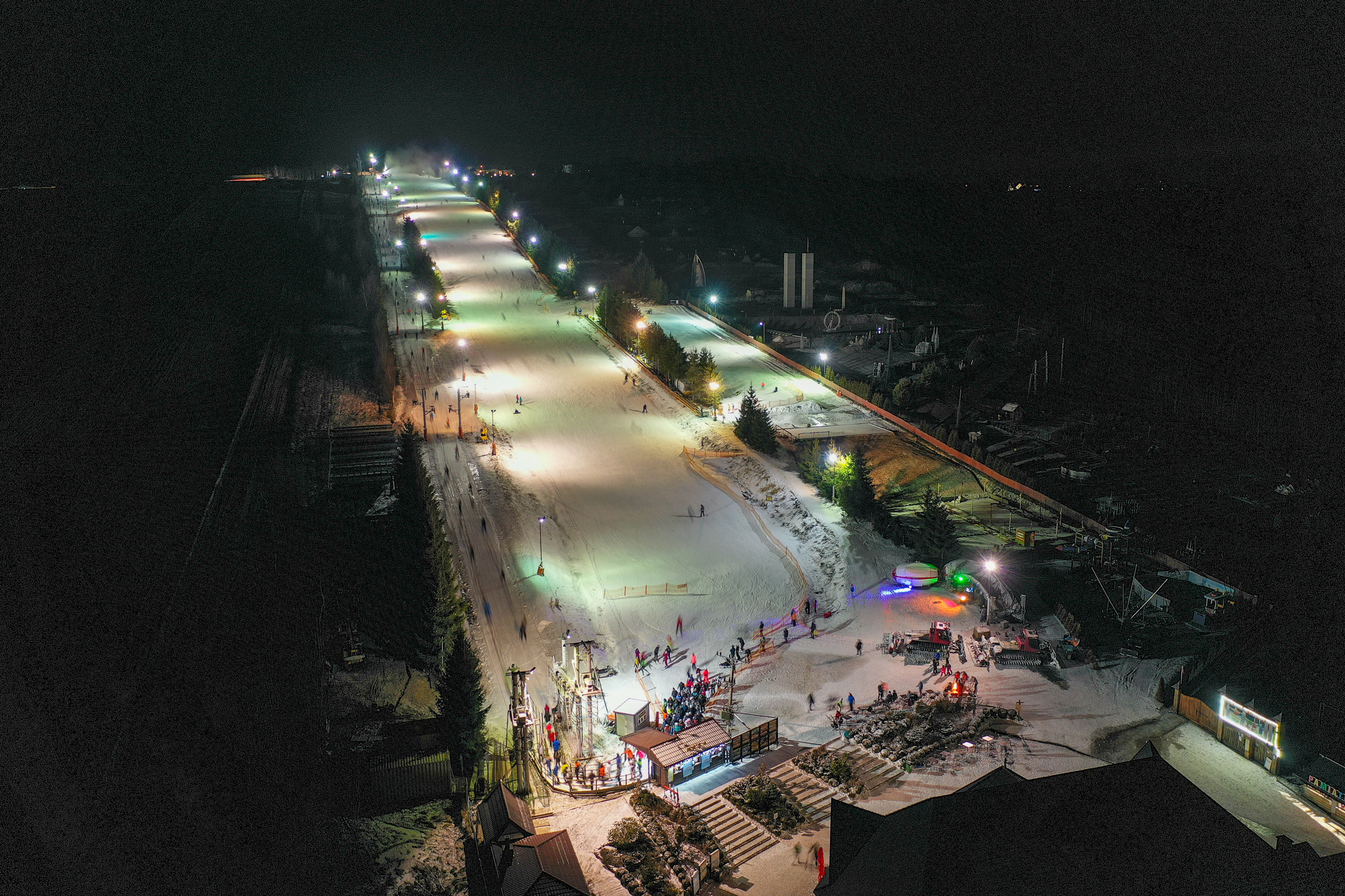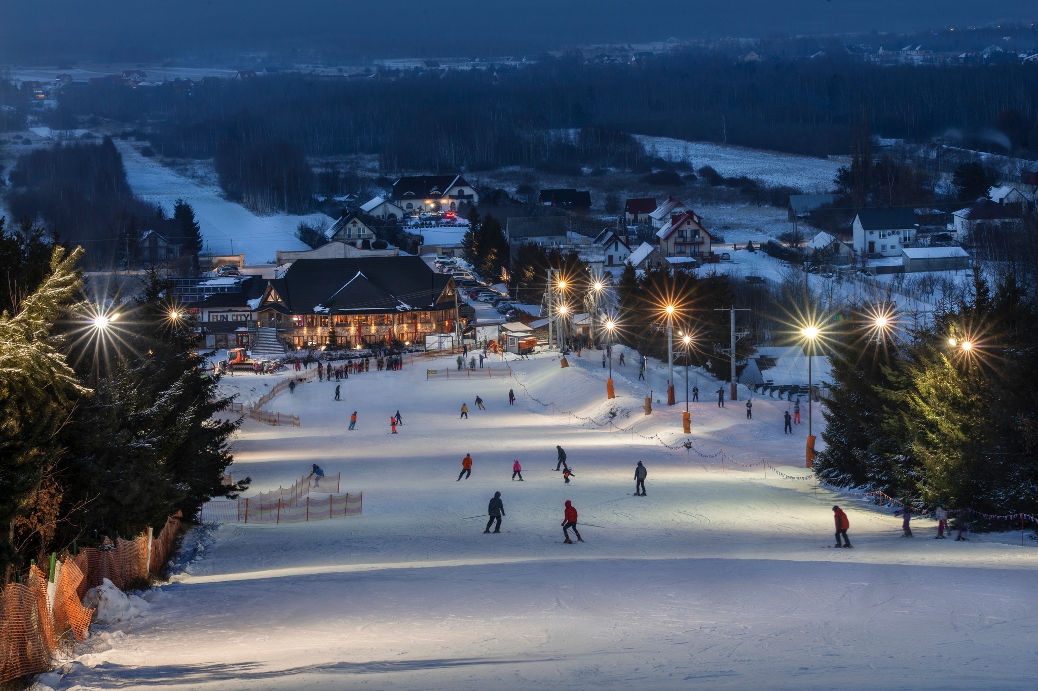 Stok oświetlony nowoczesnymi reflektorami, sztucznie naśnieżany i ratrakowany.