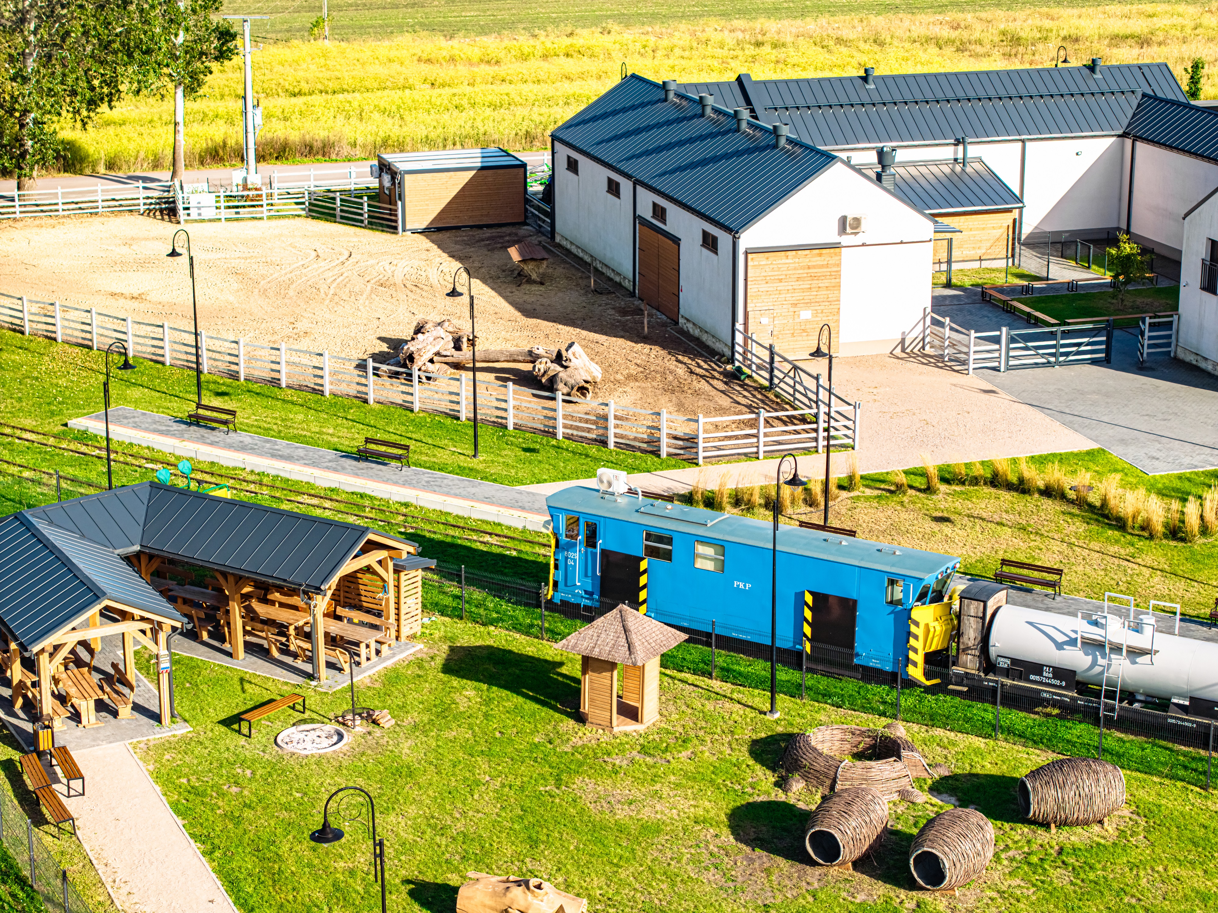 - Plac zabaw dla dzieci – wiklinowe i drewniane elementy imitujące żeremie bobrowe, kokony, żółwia, domek pszczeli czy gniazdo os.