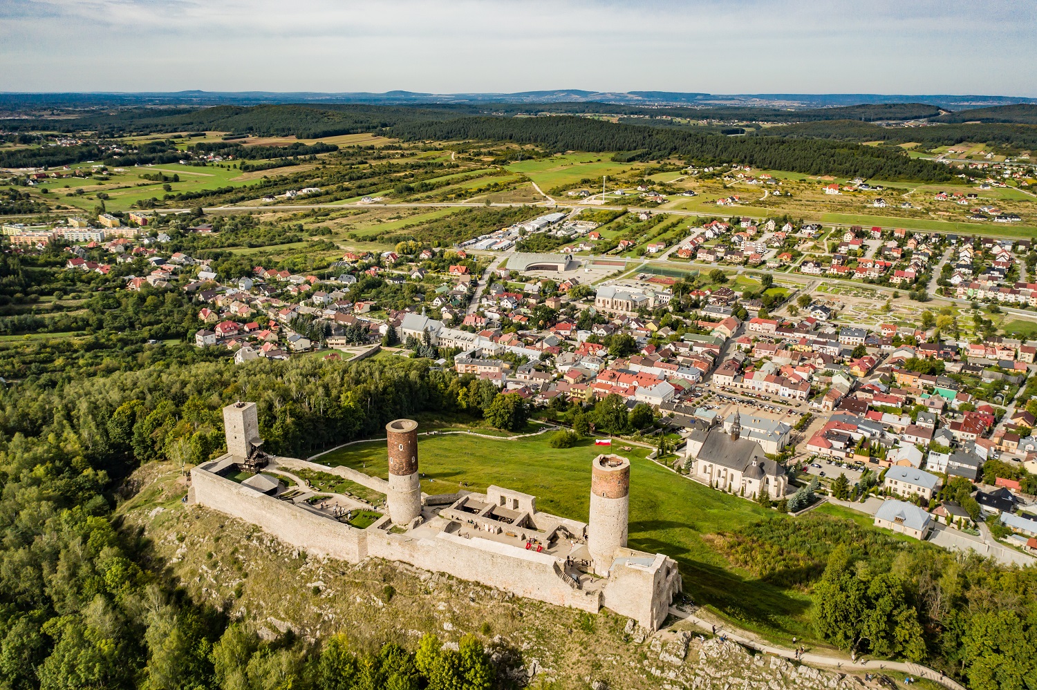 Chęciny - położenie miasta związane jest z zamkiem wzniesionym na przełomie XIII i XIV w., który ze względu na swoje walory obronne i lokalizację na przecięciu ważnych szlaków handlowych szybko zyskiwał na znaczeniu. Zamek w XIV w. uchodził za najpotężniejszą polską warownię. Zarządzany był przez starostę i broniony przez 150 żołnierzy. Już w 1318 r. zdeponowano w nim skarby katedry gnieźnieńskiej. Przed 1325 r. służebnym osadom położonym w pobliżu Zamkowej Góry nadano prawa miejskie i nazwę pobliskiej wsi – Chęciny. Odbywały się tu zjazdy rycerskie z udziałem króla.