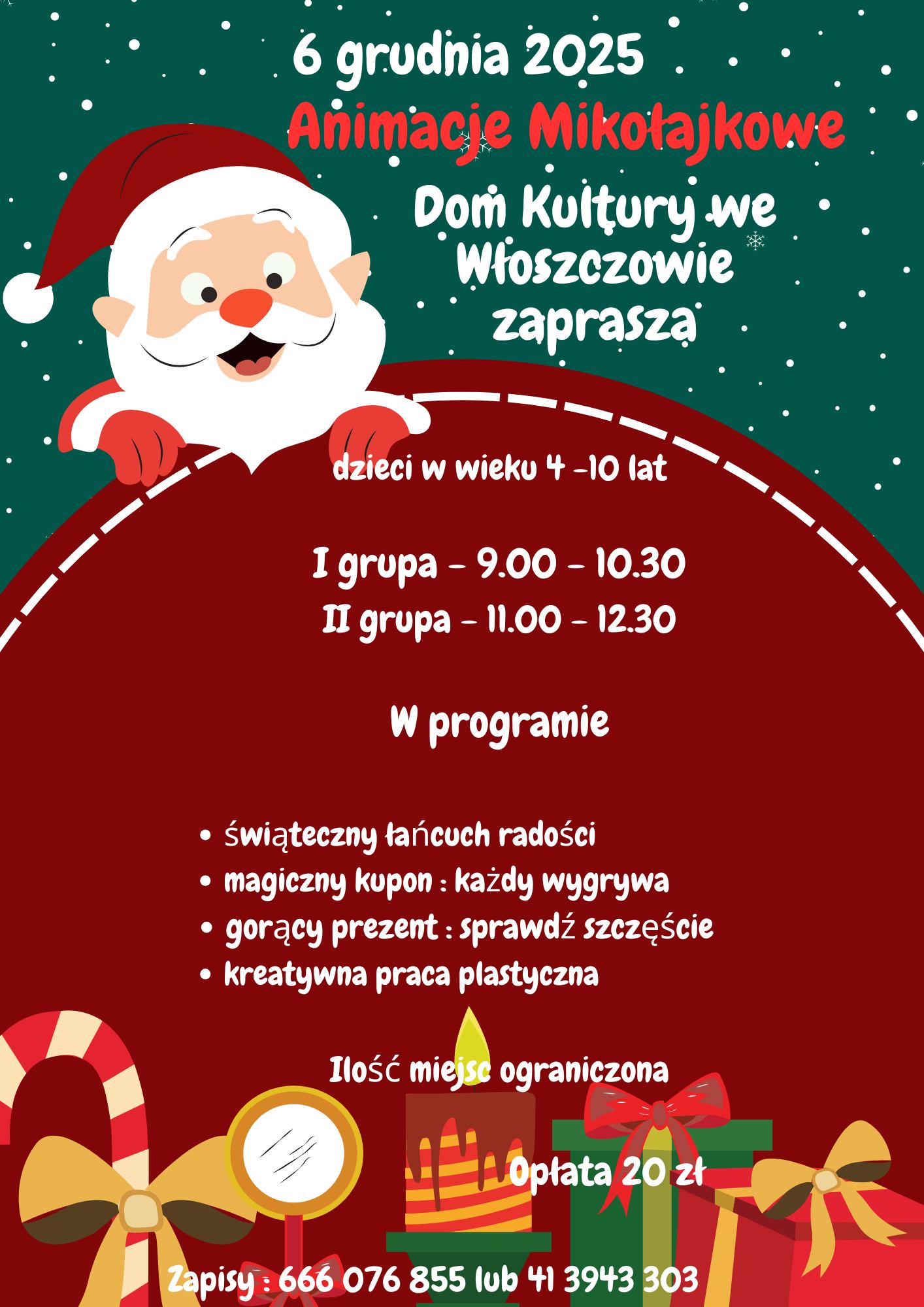 Dom Kultury we Włoszczowie serdecznie zaprasza dzieci w wieku 4 - 10 lat na Animacje Mikołajkowe.