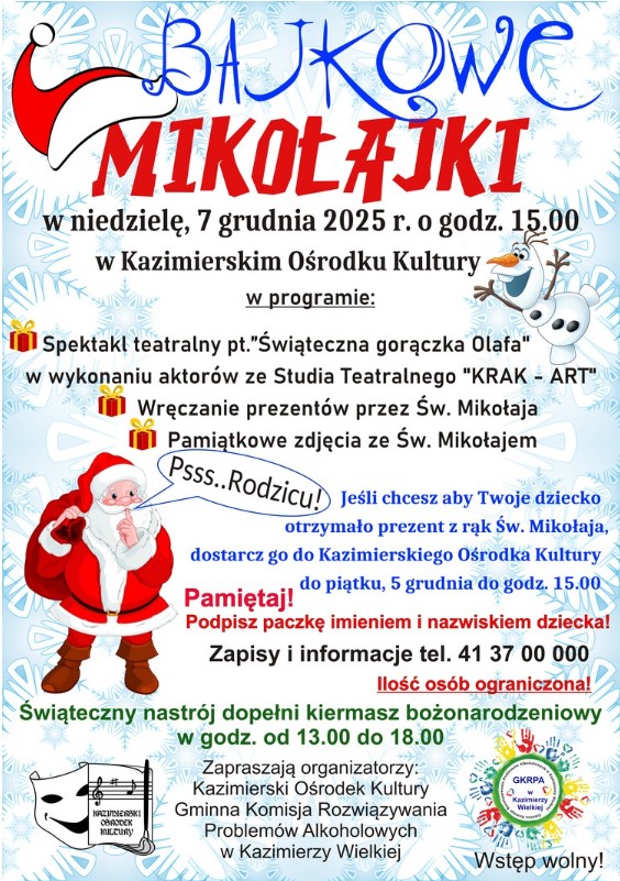 - spektakl teatralny, pt. "Świąteczna gorączka Olafa" w wykonaniu aktorów ze Studia Teatralnego "KRAK - ART";