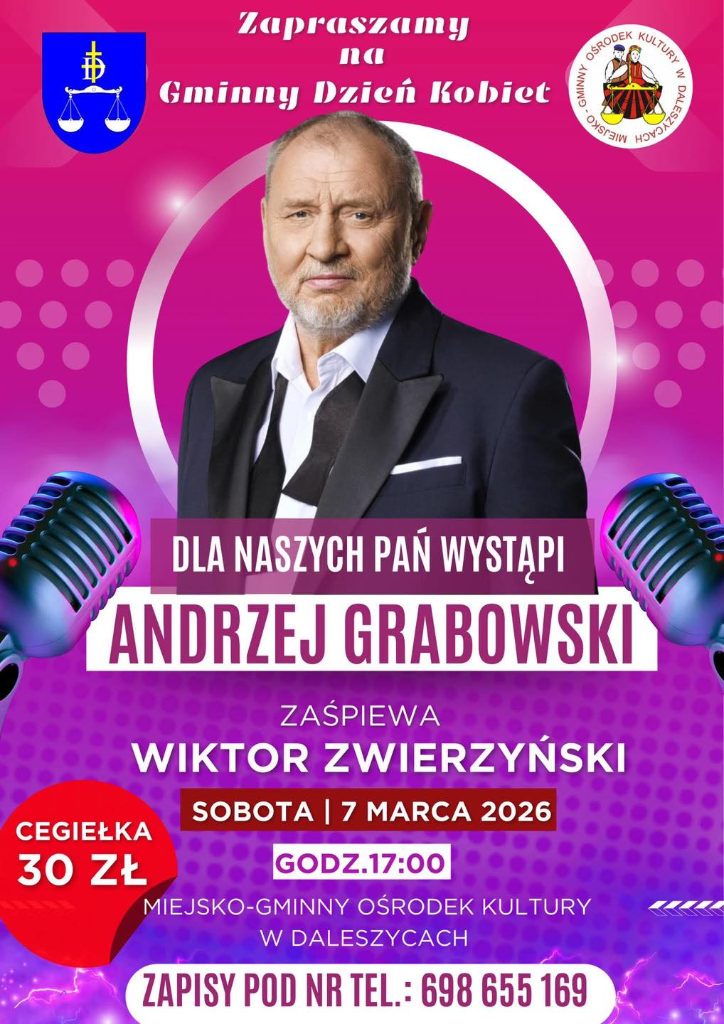 Już 7 marca w nowej siedzibie Miejsko-Gminnego Ośrodka Kultury w Daleszycach odbędzie się Gminny Dzień Kobiet. Na scenie wystąpi Andrzej Grabowski, a o muzyczne emocje zadba Wiktor Zwierzyński, utalentowany mieszkaniec gminy i uczestnik programu The Voice of Poland.