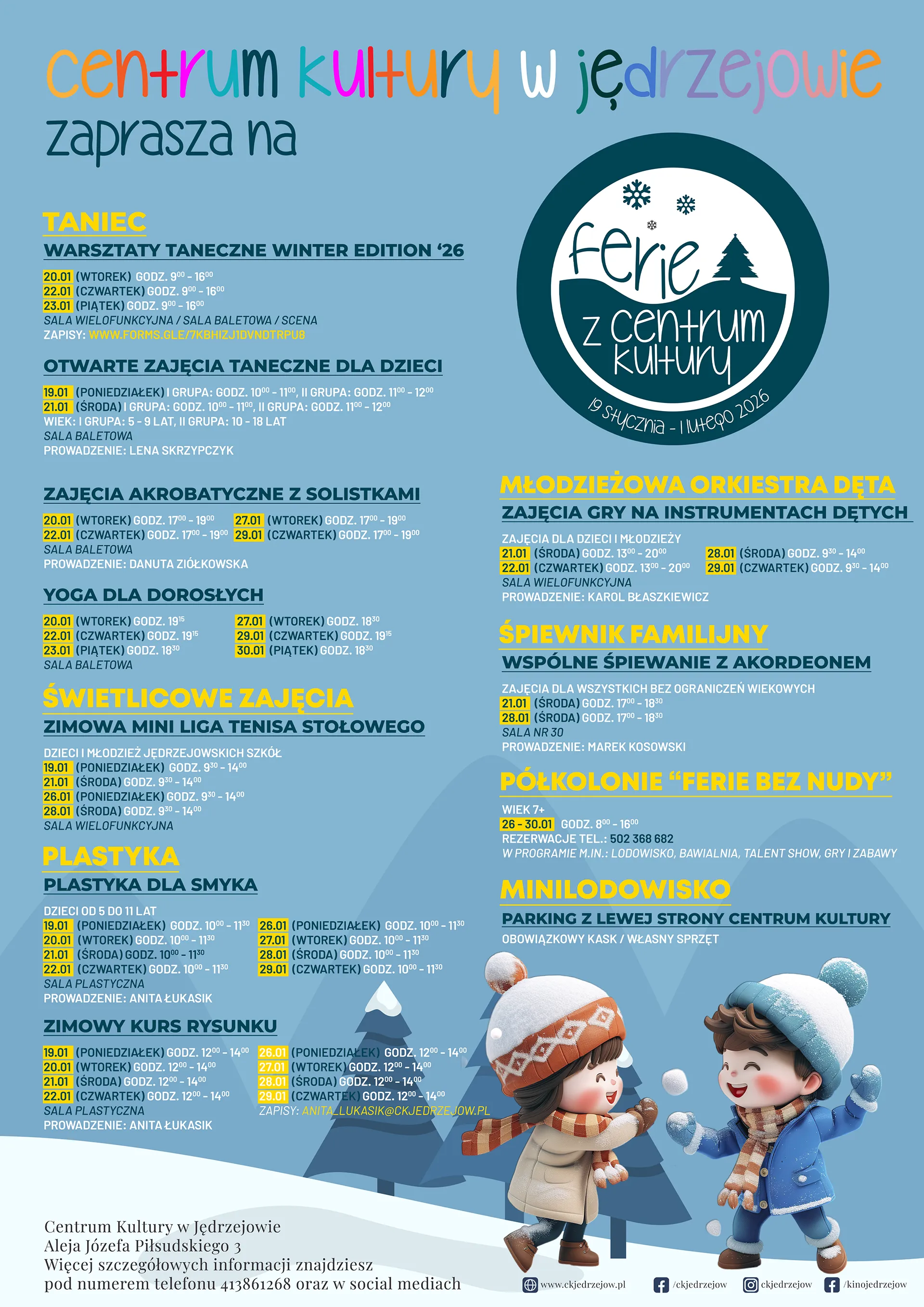 Centrum Kultury w Jędrzejowie serdecznie zaprasza najmłodszych do udziału w feryjnych zajęciach. Zaplanowano wiele atrakcji i zajęć, w których każdy znajdzie coś dla siebie. Znajdź na mapieFerie z Centrum Kultury w JędrzejowieUdostępnij: