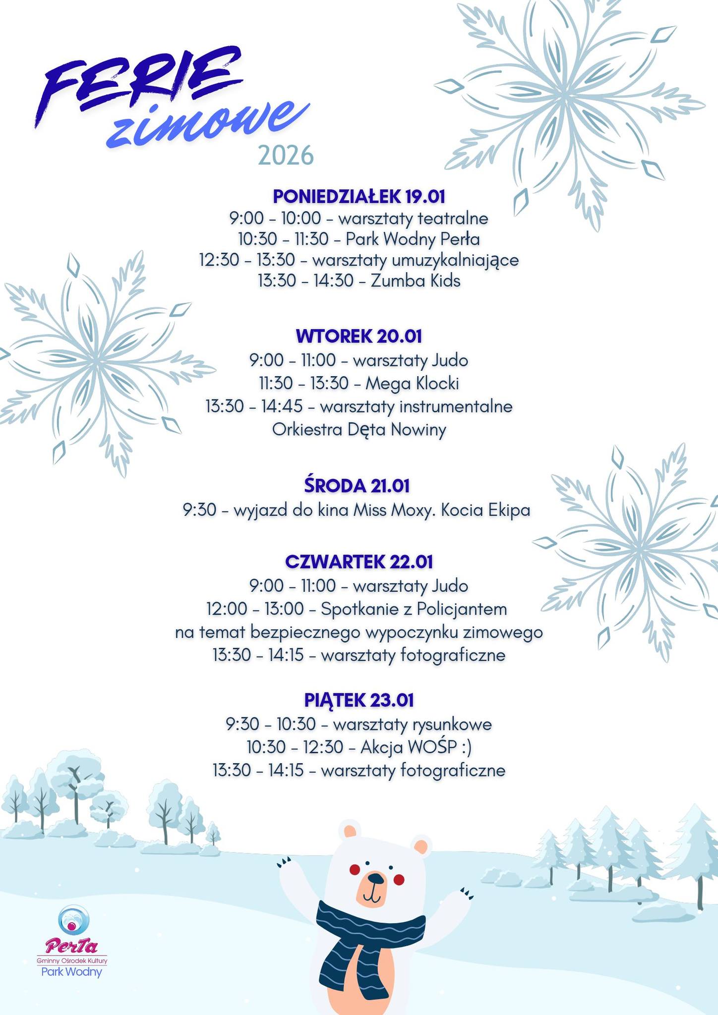 Gminny Ośrodek Kultury w Nowinach serdecznie zaprasza najmłodszych na wyjątkowe ferie zimowe. W programie zaplanowano wiele atrakcji, warsztatów i zajęć. Znajdź na mapieFerie zimowe w NowinachUdostępnij: