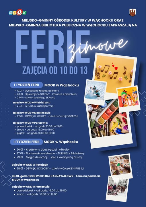 Miejsko-Gminny Ośrodek Kultury w Wąchocku wraz z Biblioteką serdecznie zapraszają dzieci na niezwykłe ferie zimowe, które pełne będą ciekawych i kreatywnych zajęć oraz atrakcji.