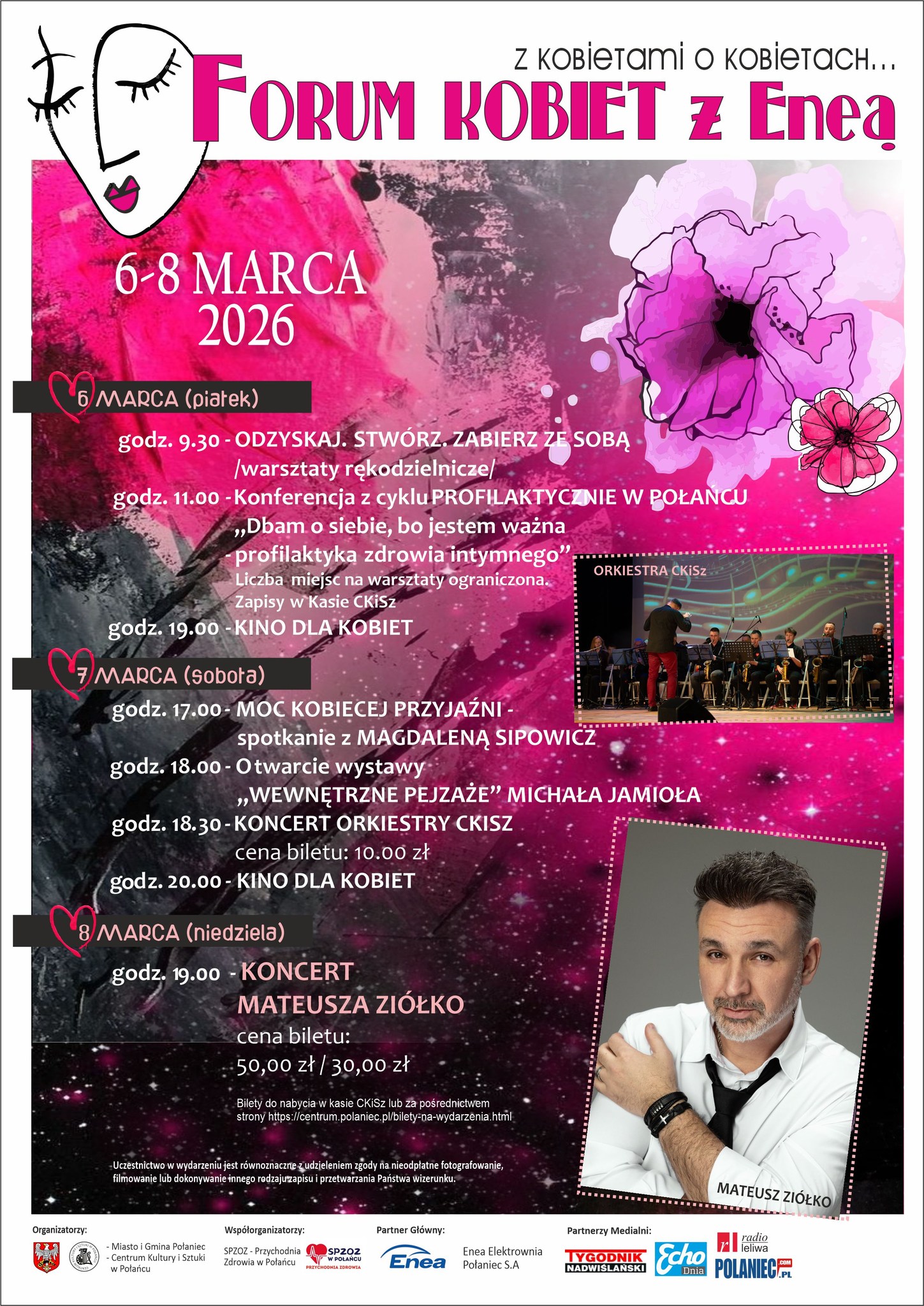 Weekend rozpocznie się 6 marca warsztatami rękodzieła „Odzyskaj. Stwórz. Zabierz ze sobą”, konferencją „Dbam o siebie, bo jestem ważna” poświęconą zdrowiu intymnemu kobiet oraz seansem Kina dla Kobiet. 7 marca uczestniczki spotkają się z Magdaleną Sipowicz w temacie przyjaźni kobiet, obejrzą wystawę „Wewnętrzne pejzaże” Michała Jamioła, posłuchają koncertu Orkiestry CKiSz i będą mogły znów wybrać się do kina. Finał 8 marca to koncert Mateusza Ziółko, który idealnie zakończy weekend pełen emocji i inspiracji.