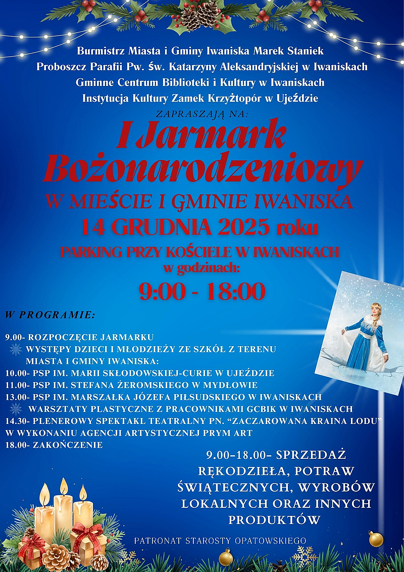 Serdecznie zapraszamy na I Jarmark Bożonarodzeniowy w mieście i gminie Iwaniska, który odbędzie się 14 grudnia 2025 roku. Podczas wydarzenia zaplanowano wiele atrakcji i stoisk z ciekawymi przedmiotami.