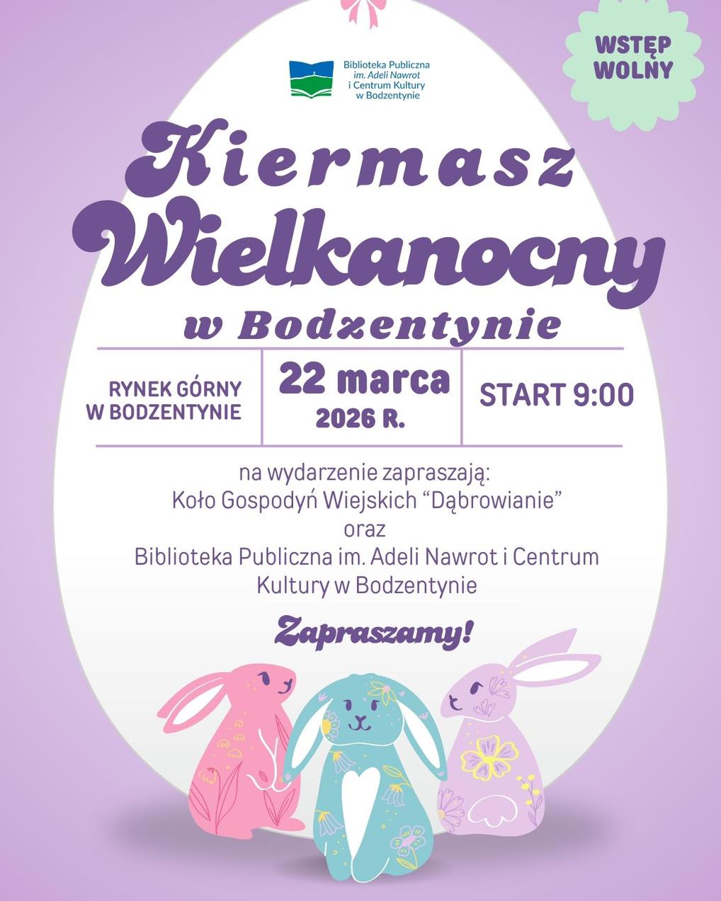Zapraszamy mieszkańców oraz gości na Kiermasz Wielkanocny w Bodzentynie, który odbędzie się 22 marca 2026 roku od godziny 9:00 na Rynku Górnym w Bodzentynie.