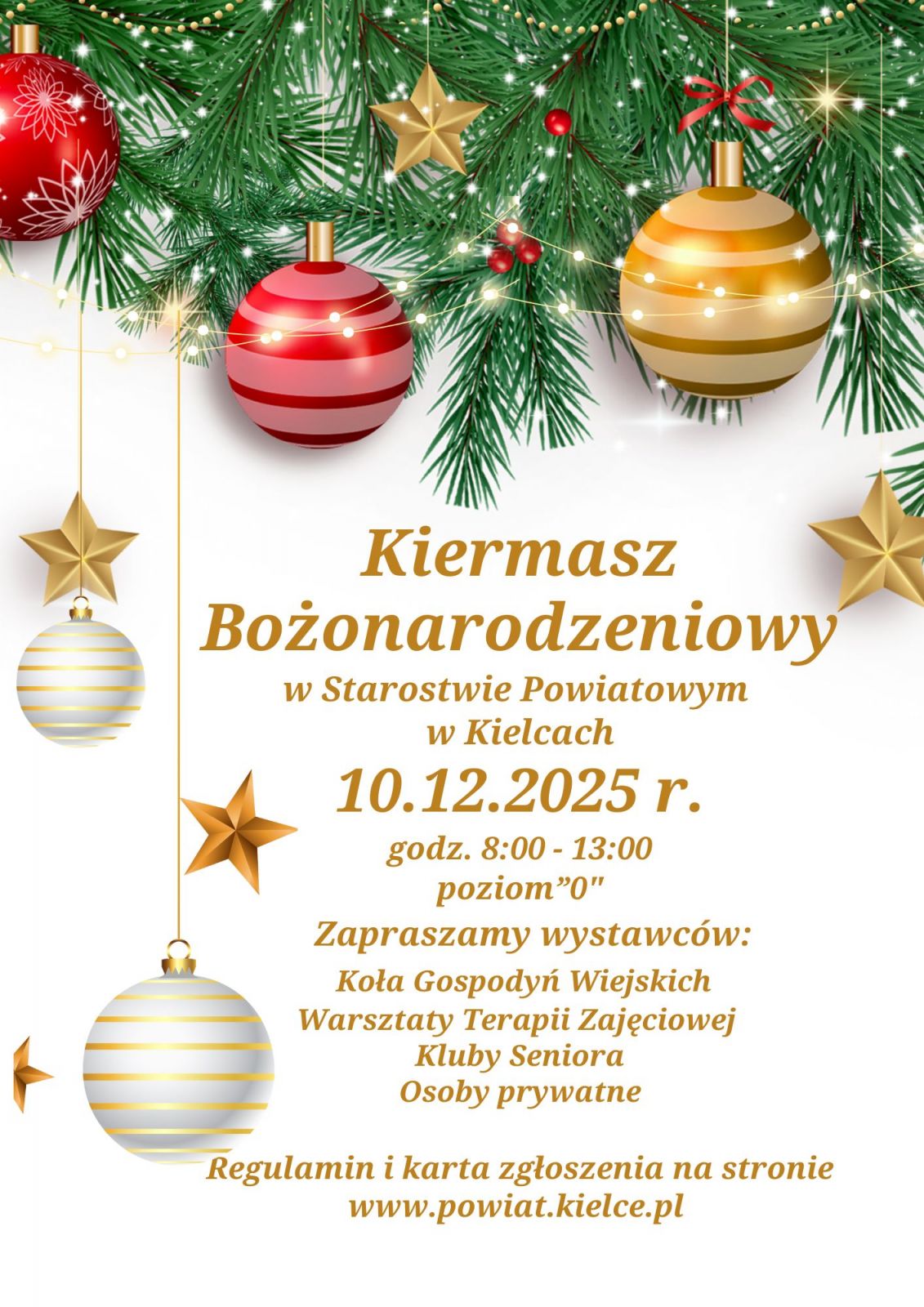 Starostwo Powiatowe w Kielcach zaprasza na Kiermasz Bożonarodzeniowy, w środę, 10 grudnia w godzinach 8:00 - 13:00. Hol na poziomie „0” wypełni się stoiskami uginającymi się od świątecznego rękodzieła wykonanego przez uczestników warsztatów terapii zajęciowej, kluby seniora, koła gospodyń wiejskich, czy osoby prywatne.