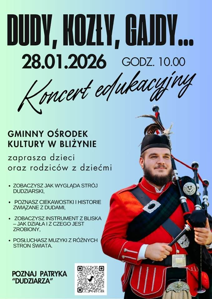 Gminny Ośrodek Kultury w Bliżynie serdecznie zaprasza na koncert edukacyjny, pt. "Dudy, kozły, gady...", który odbędzie się 28 stycznia o godz. 10:00.Znajdź na mapieKoncert edukacyjny "Dudy, kozły, gady..." w BliżynieUdostępnij: