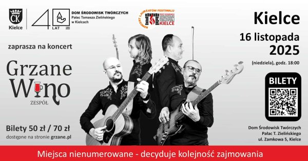 Zapraszamy na wyjątkowy wieczór pełen muzyki i emocji! Zespół Grzane Wino zagra swoje najlepsze utwory i stworzy magiczną atmosferę, w której nastrojowe ballady i pełne energii kompozycje połączą pokolenia i poruszą serca.