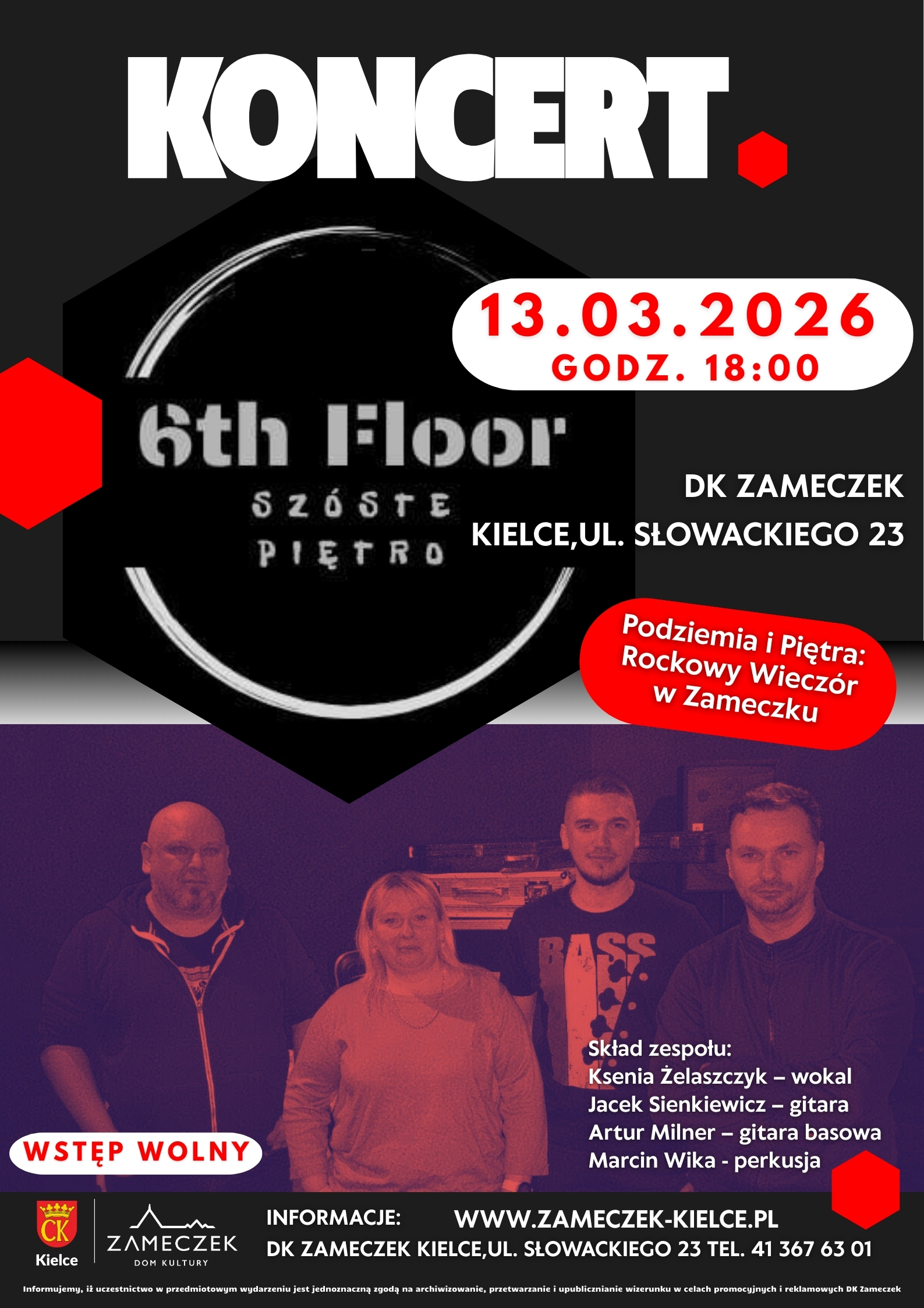 Dom Kultury „Zameczek” zaprasza na Koncert zespołu „Szóste piętro”, który odbędzie się 13 marca 2026 roku o godzinie 18:00 w sali kameralnej Domu Kultury „Zameczek” w Kielcach.