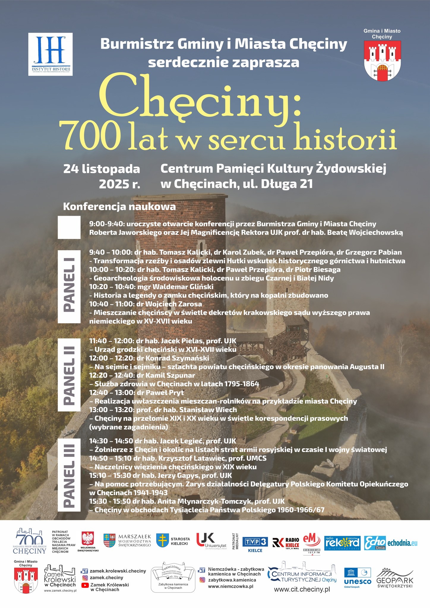 Burmistrz Gminy i Miasta Chęciny Robert Jaworski serdecznie zaprasza do udziału w konferencji naukowej "Chęciny: 700 lat w sercu historii". Spotkanie odbędzie się  24 listopada 2025 r. o godz. 9:00 w Centrum Pamięci Kultury Żydowskiej w Chęcinach.