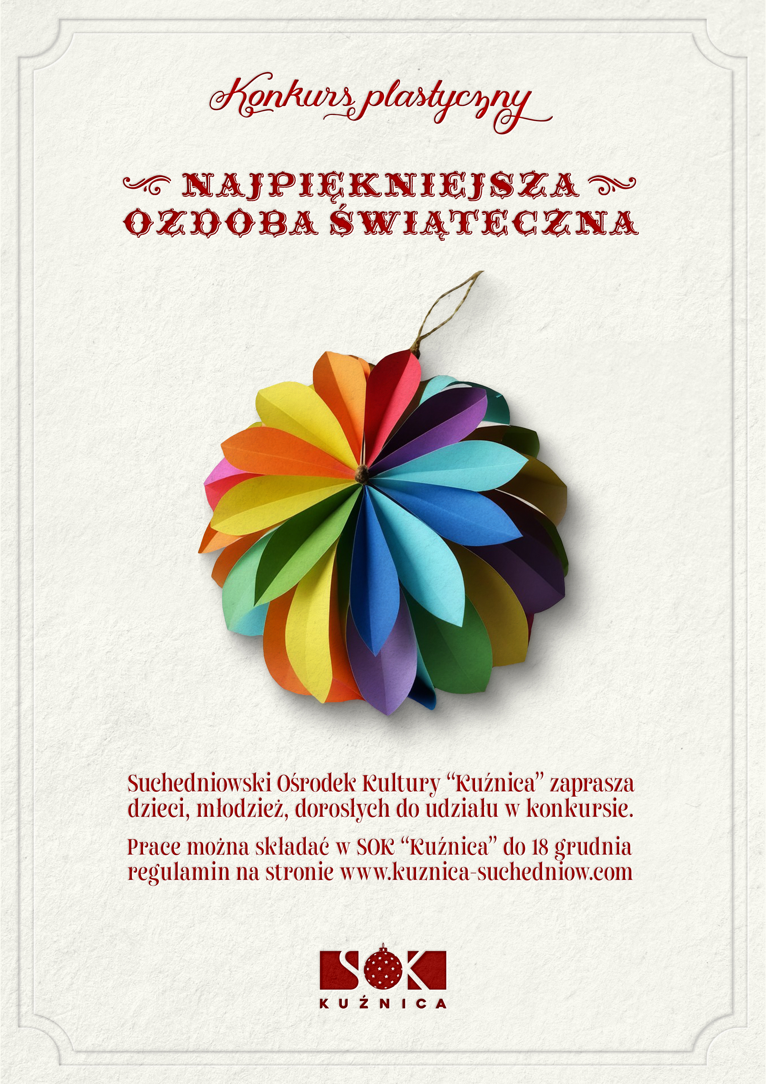 Suchedniowski Ośrodek Kultury "Kuźnica" zachęca dzieci, młodzież i osoby dorosłe do udziału w konkursie plastycznym "Najpiękniejsza ozdoba świąteczna". Prace można dostarczać do SOK "Kuźnica" do dnia 18 grudnia 2025 r. Rozstrzygnięcie konkursu nastąpi w dniu 22 grudnia 2025 r.
