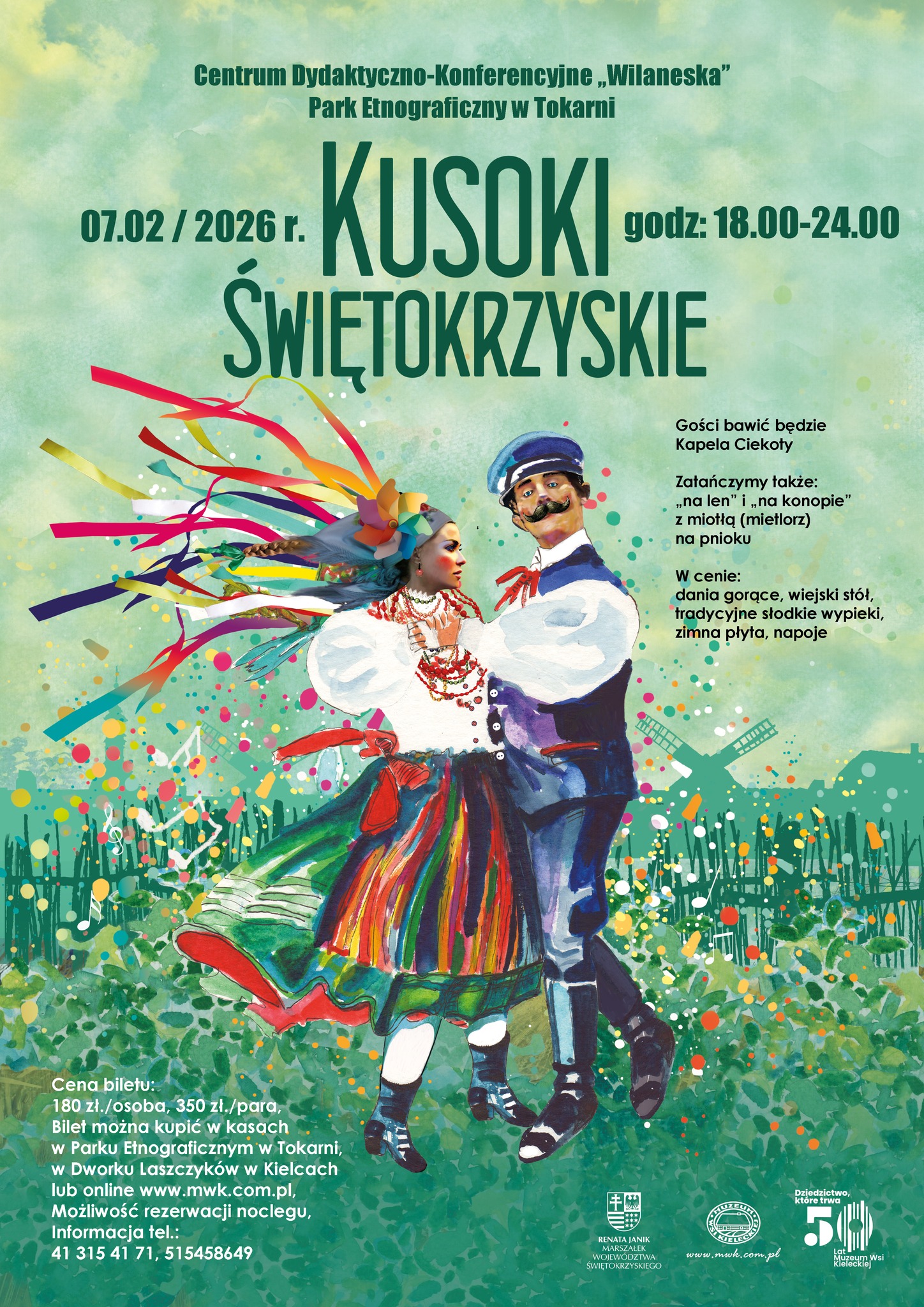 Muzeum Wsi Kieleckiej serdecznie zaprasza na zabawę taneczną "Kusoki Świętokrzyskie", która odbędzie się 7 lutego o godz. 18:00 w Centrum Dydaktyczno-Konferencyjnym Wilaneska w Tokarni.