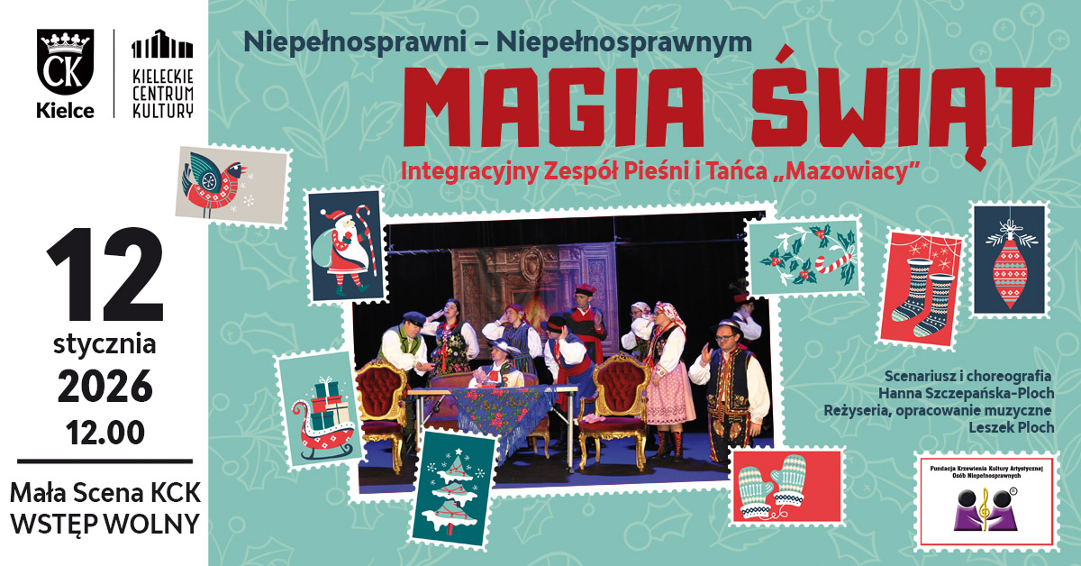 Zespół „Mazowiacy” z Warszawy zaprasza na wyjątkowe świąteczne widowisko w wykonaniu osób z różnymi niepełnosprawnościami. Spektakl „Magia Świąt” trwa godzinę i pełen jest polskich zwyczajów, kolęd oraz ciekawych bohaterów.