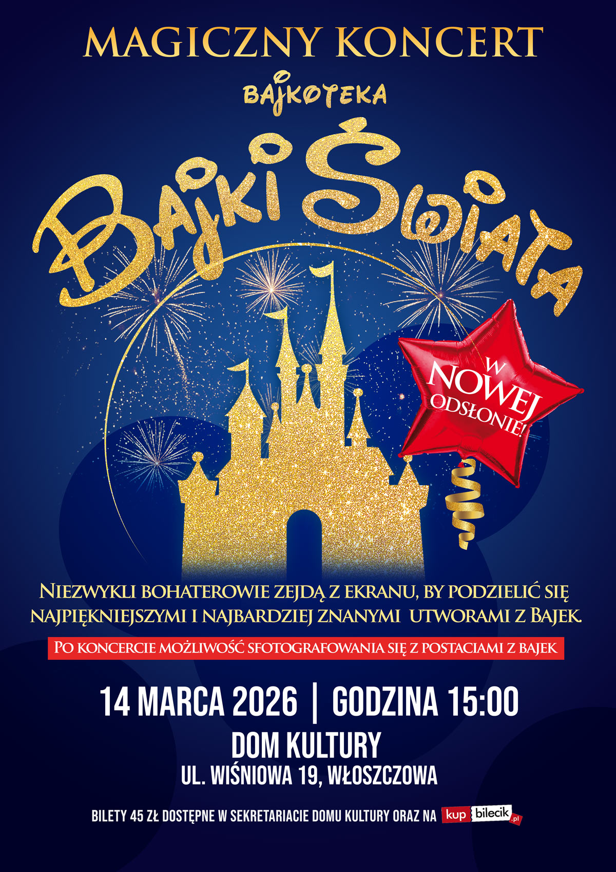 Zapraszamy Was do niezwykłej przygody – bajkowej podróży przez różne wspaniałe krainy, gdzie wszystko jest możliwe! 14 Marca 2026 o godz.15.00 w Domu Kultury we Włoszczowie na MAGICZNY KONCERT - BAJKOTEKA, BAJKI ŚWIATA.