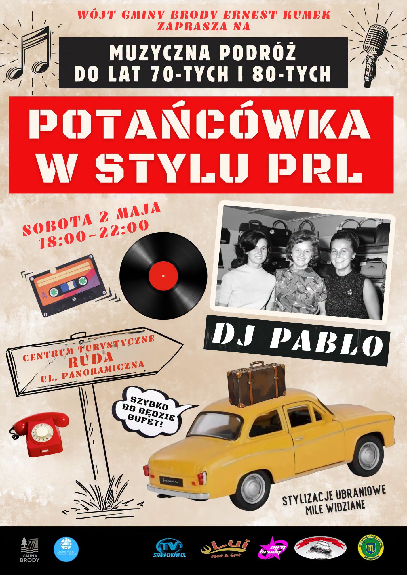Muzyczna podróż do lat 70-tych i 80-tych czeka na wszystkich, którzy na majówkę przyjadą do Gminy Brody. To będzie prawdziwa potancówka w stylu PRL-u.
