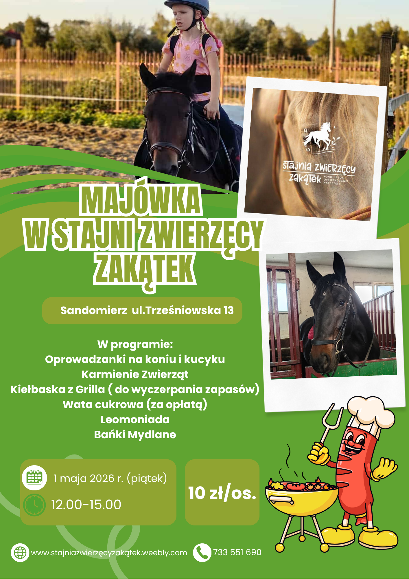 Serdecznie zapraszamy na Majówkę w Stajni Zwierzęcy Zakątek w Sandomierzu. Podczas wydarzenia zaplanowano wiele atrakcji. Znajdź na mapieMajówka w Stajni Zwierzęcy Zakątek w SandomierzuUdostępnij:
