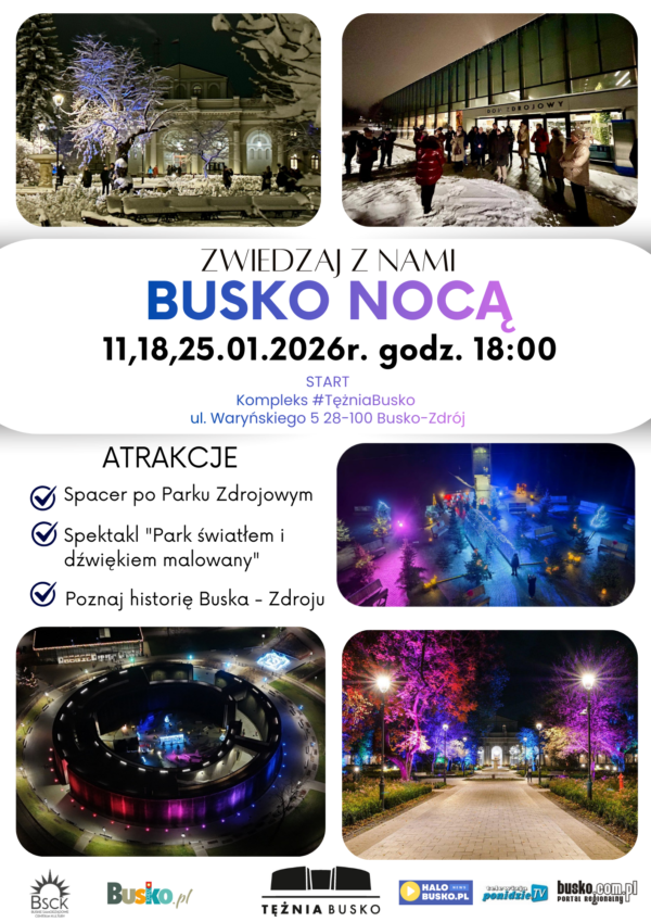 Serdecznie zapraszamy na nocne zwiedzanie Buska-Zdroju. Podczas wydarzenia zaplanowano następujące atrakcje: spacer po Parku Zdrojowym, spektakl "Park światłem i dźwiękiem malowany". Uczestnicy podczas spaceru poznają także historię miasta.