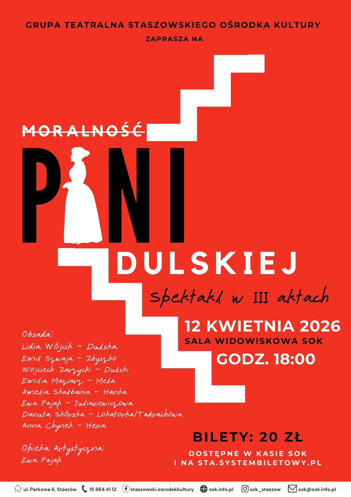 Grupa Teatralna działająca przy Staszowskim Ośrodku Kultury ponownie zaprasza publiczność na spektakl „Moralność Pani Dulskiej”. Po ciepłym przyjęciu podczas premiery przedstawienie wraca na scenę i ponownie będzie można je obejrzeć 12 kwietnia 2026 r. o godz. 18:00 w sali widowiskowej Staszowskiego Ośrodka Kultury.