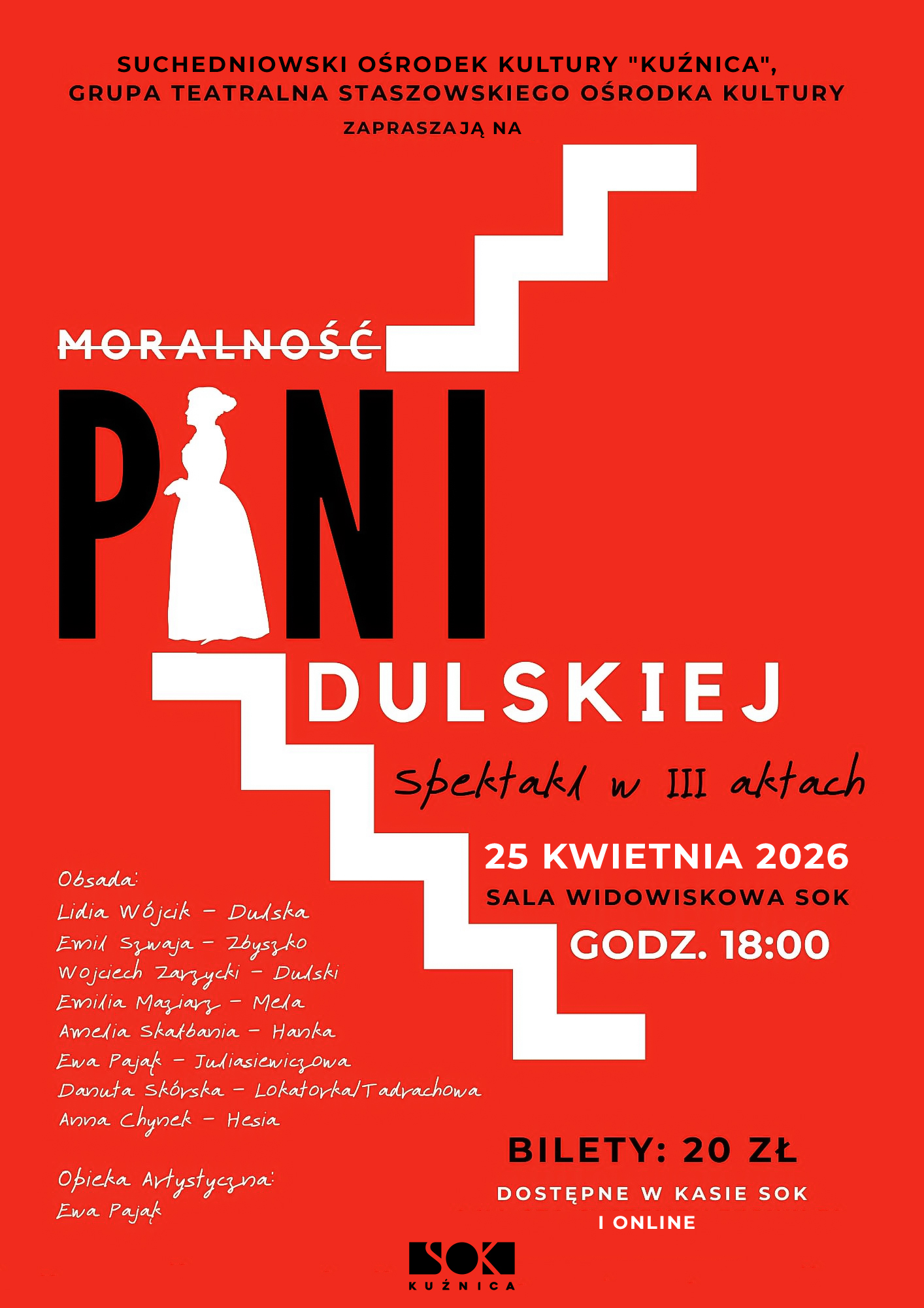 Suchedniowski Ośrodek Kultury "Kuźnica" i Grupa Teatralna Staszowskiego Ośrodka Kultury zapraszają na spektakl w III aktach pt. "Moralność Pani Dulskiej", który odbędzie się w dniu 25 kwietnia 2026 r. o godz. 18:00 w sali widowiskowej SOK "Kuźnica".