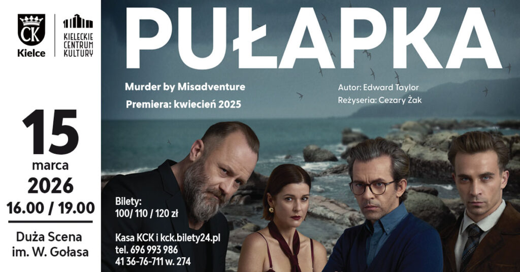 Serdecznie zapraszamy na spektakl kryminalny "Pułapka" w reżyserii Cezarego Żaka, który będzie można obejrzeć w Kieleckim Centrum Kultury już 15 marca o godz. 16:00 i 19:00.