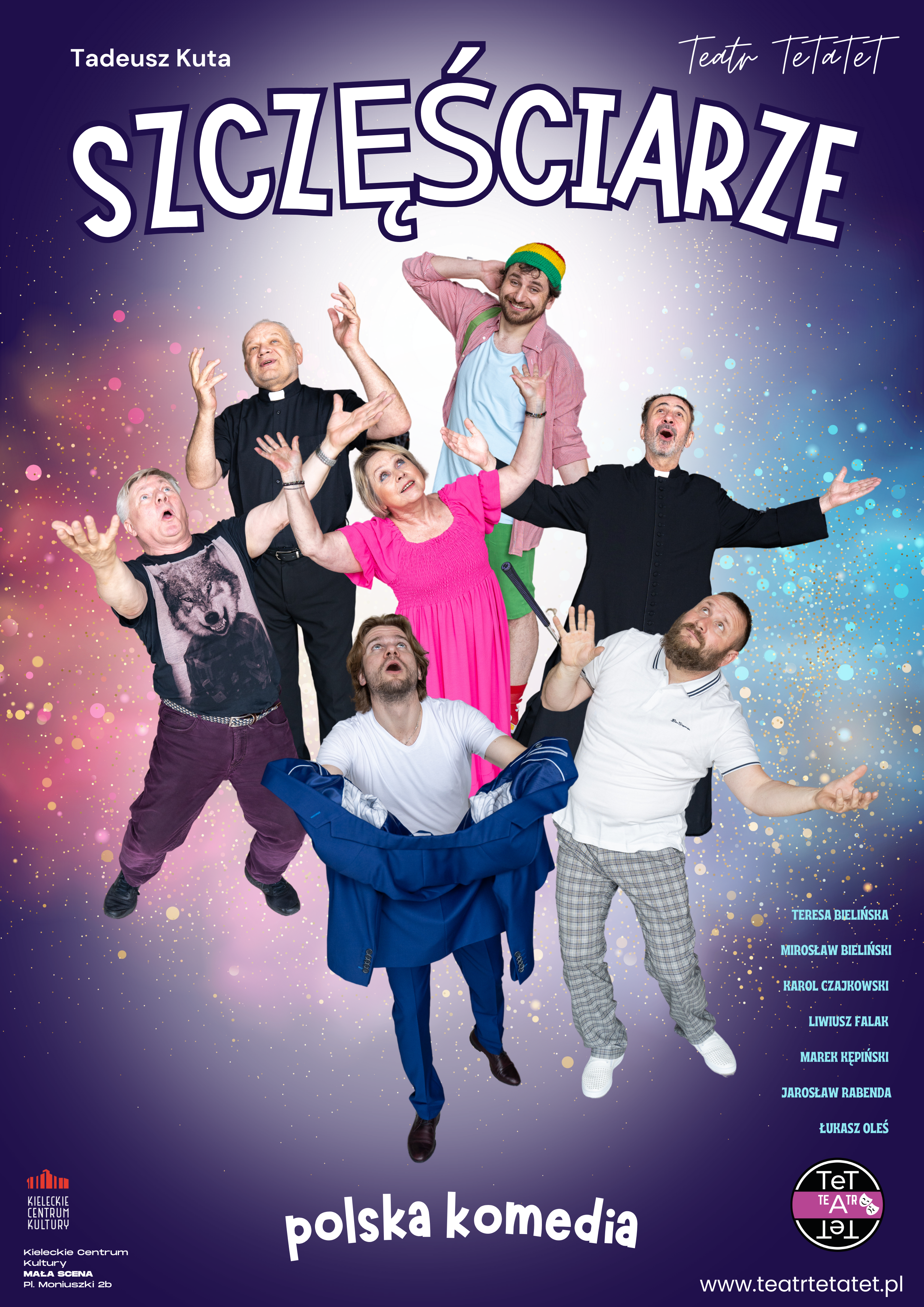 "Szczęściarze" to hitowa polska komedia autorstwa i reżyserii Tadeusza Kuty. Ten niezwykły spektakl obejrzeć można będzie na scenie Kieleckiego Centrum Kultury w dniu 22 lutego 2026 r. roku o godz. 17:00.
