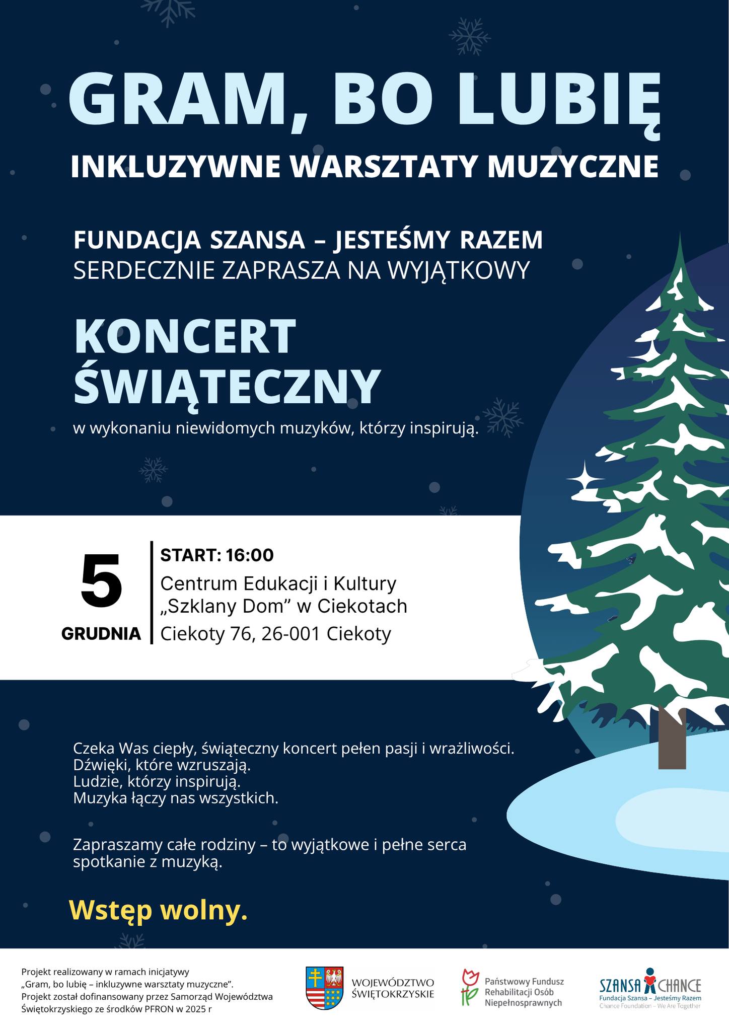 To spotkanie z muzyką, która płynie prosto z serca. Artyści zaprezentują świąteczne utwory pełne ciepła i wrażliwości, pokazując, jak wiele można opowiedzieć samymi dźwiękami. Koncert odbywa się w ramach inkluzyjnych warsztatów, podczas których uczestnicy rozwijają swoje pasje i dzielą się nimi z innymi.