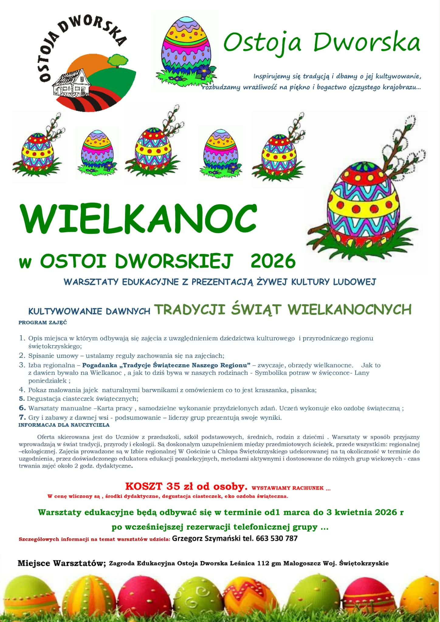 Wielkanoc w Ostoi Dworskiej 2026 to edukacyjne warsztaty inspirowane dawnymi tradycjami świąt wielkanocnych regionu świętokrzyskiego. Uczestnicy poznają zwyczaje, obrzędy i symbolikę świąt