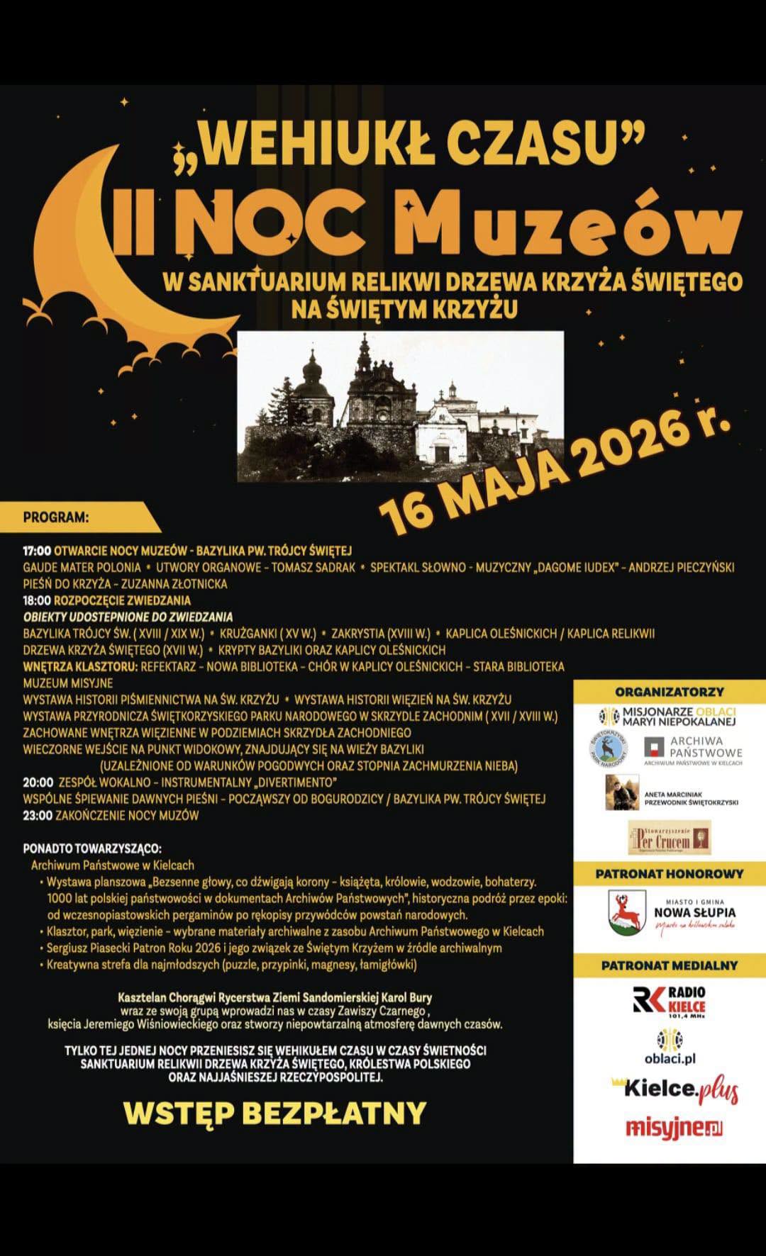 W tym roku Sanktuarium Relikwii Drzewa Krzyża Świętego na Łysej Górze zaprasza na drugą edycję Nocy Muzeów, która odbędzie się pod hasłem „Wehikuł czasu”. Będzie to wyjątkowa okazja, aby przenieść się w różne epoki historii tego niezwykłego miejsca - gdzie przeszłość i teraźniejszość splatają się w jedno, a każda chwila niesie ze sobą obietnicę niezwykłego spotkania.