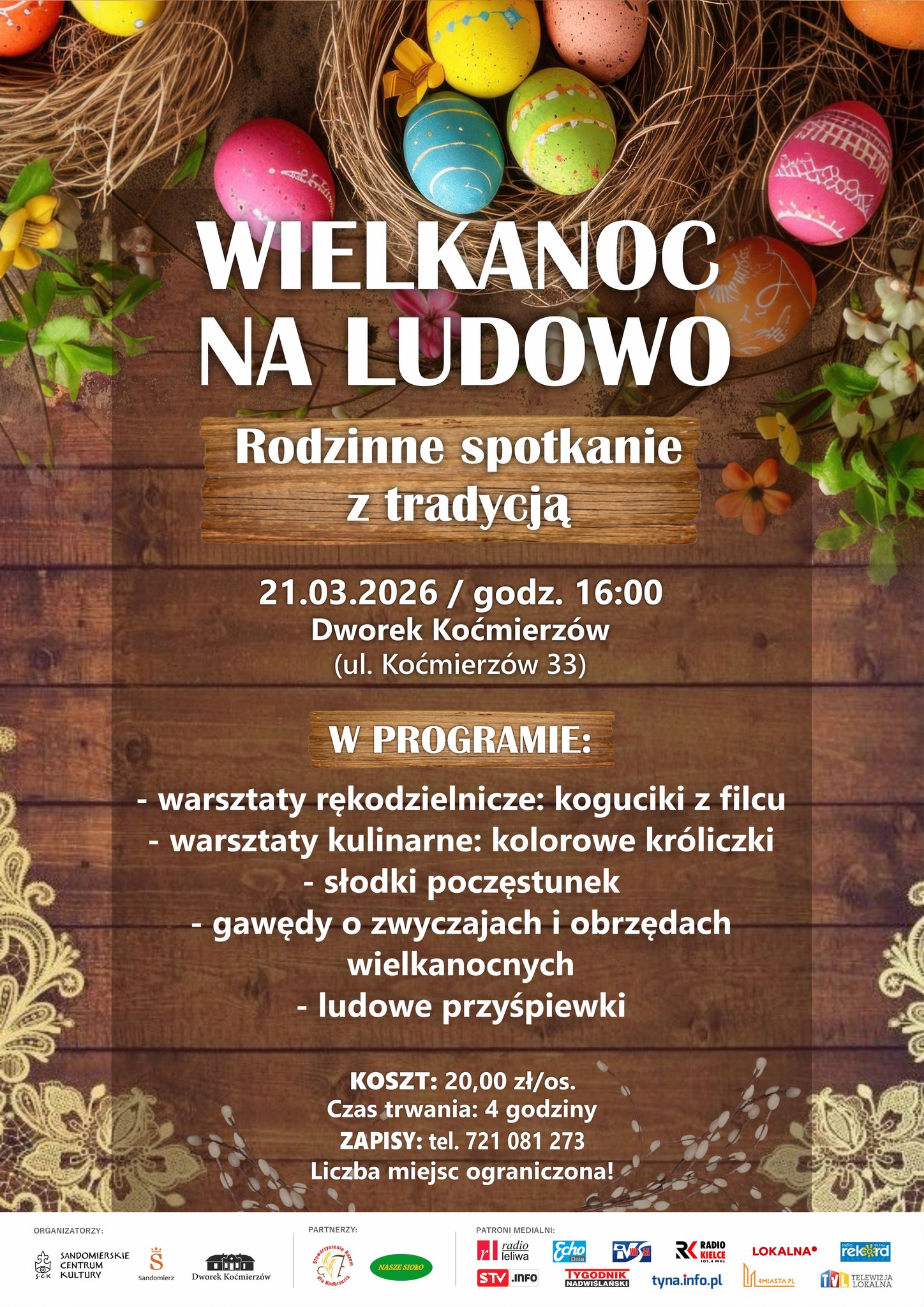Sandomierskie Centrum Kultury oraz Urząd Miejski w Sandomierzu zapraszają na rodzinne spotkanie z wielkanocnymi tradycjami, które odbędzie się 21 marca 2026 r. o godz. 16:00 w Dworek Koćmierzów.