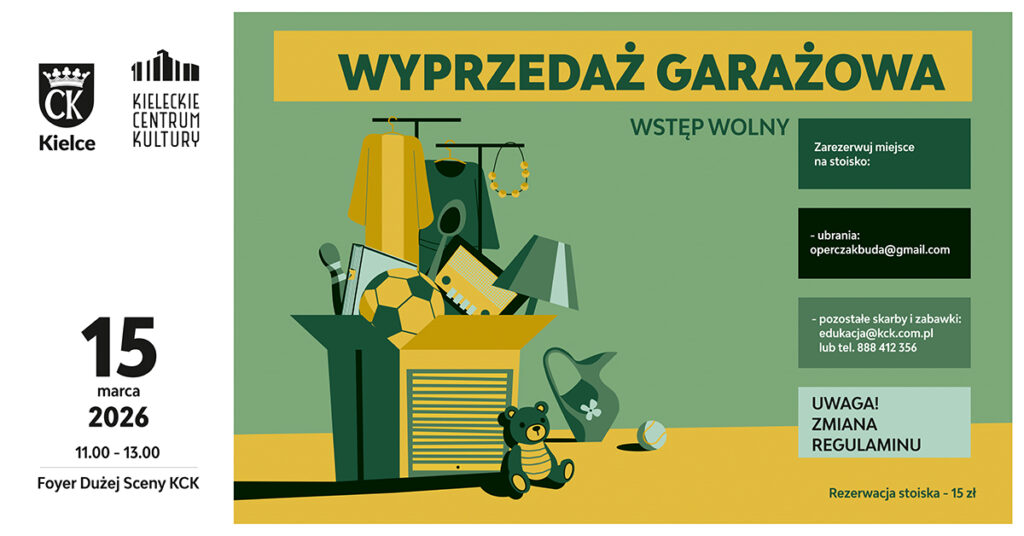 Serdecznie zapraszamy na wyprzedaż garażową, która odbędzie się 15 marca w Kieleckim Centrum Kultury w godz. 11:00-13:00. Na miejscu będzie można znaleźć stoiska z biżuterią, ubraniami, torebki oraz innymi rzeczami.