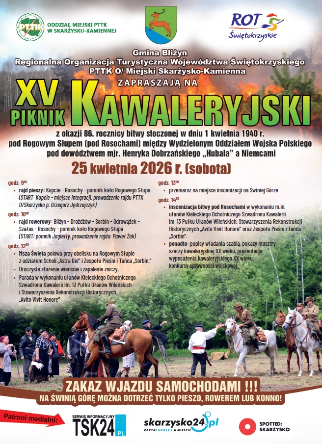 Serdecznie zapraszamy na XV Piknik Kawaleryjski z okazji 86. rocznicy bitwy stoczonej w dniu 1 kwietnia 1940 r. pod Rogowym Słupem (pod Rosochami) między Wydzielonym Oddziałem Wojska Polskiego pod dowództwem mjr. Henryka Dobrzańskiego "Hubala", a Niemcami.
